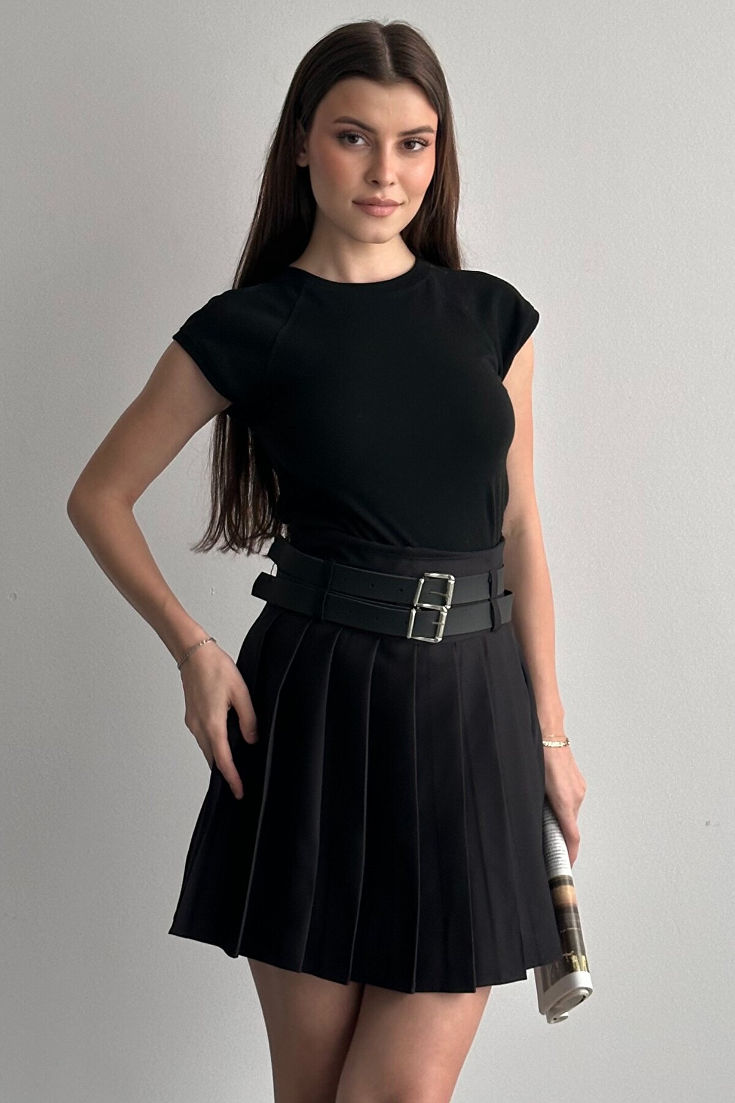 Çift kemer detayıyla öne çıkan yüksek bel pileli mini etek, günlük kombinlerin vazgeçilmez tamamlayıcı parçasıdır.; ; Modern ve güçlü stilin en iddialı parçalarından biri olan çift kemer detaylı pileli mini etek, günlük kombinlerden şehir stiline kadar birçok kullanım alanı sunar.; ; Yüksek bel tasarımı vücut formunu dengelerken pileli yapısı hareketli ve zarif bir görünüm kazandırır.; ; Bel kısmında yer alan çift kemer detayı ürüne karakter kazandırırken, kombinlerin odak noktası olmasını sağlar.; ; Günlük kullanımda basic tişört, crop, gömlek ve blazer ceketlerle rahatlıkla tamamlanabilir.; ; Akıcı formu sayesinde yürüyüş sırasında doğal hareket sağlar ve gün boyu konforlu kullanım sunar.; ; Hem spor hem şık kombinlere uyum sağlayabilen zamansız bir tasarımdır.; ; Yüksek bel form ; Çift kemer detay tasarım ; Pileli mini etek kesimi ; Günlük ve şehir stiline uygun ; Kombin tamamlayıcı modern görünüm ; Gardırobun kurtarıcı parçalarından biri olacak bu model, stiline güçlü ve dikkat çekici bir dokunuş katmak isteyen kadınlar için tasarlanmıştır.; ; Manken Ölçüleri: Boy:1.70cm Kilo:58kg (Üzerindeki ürün S bedendir);