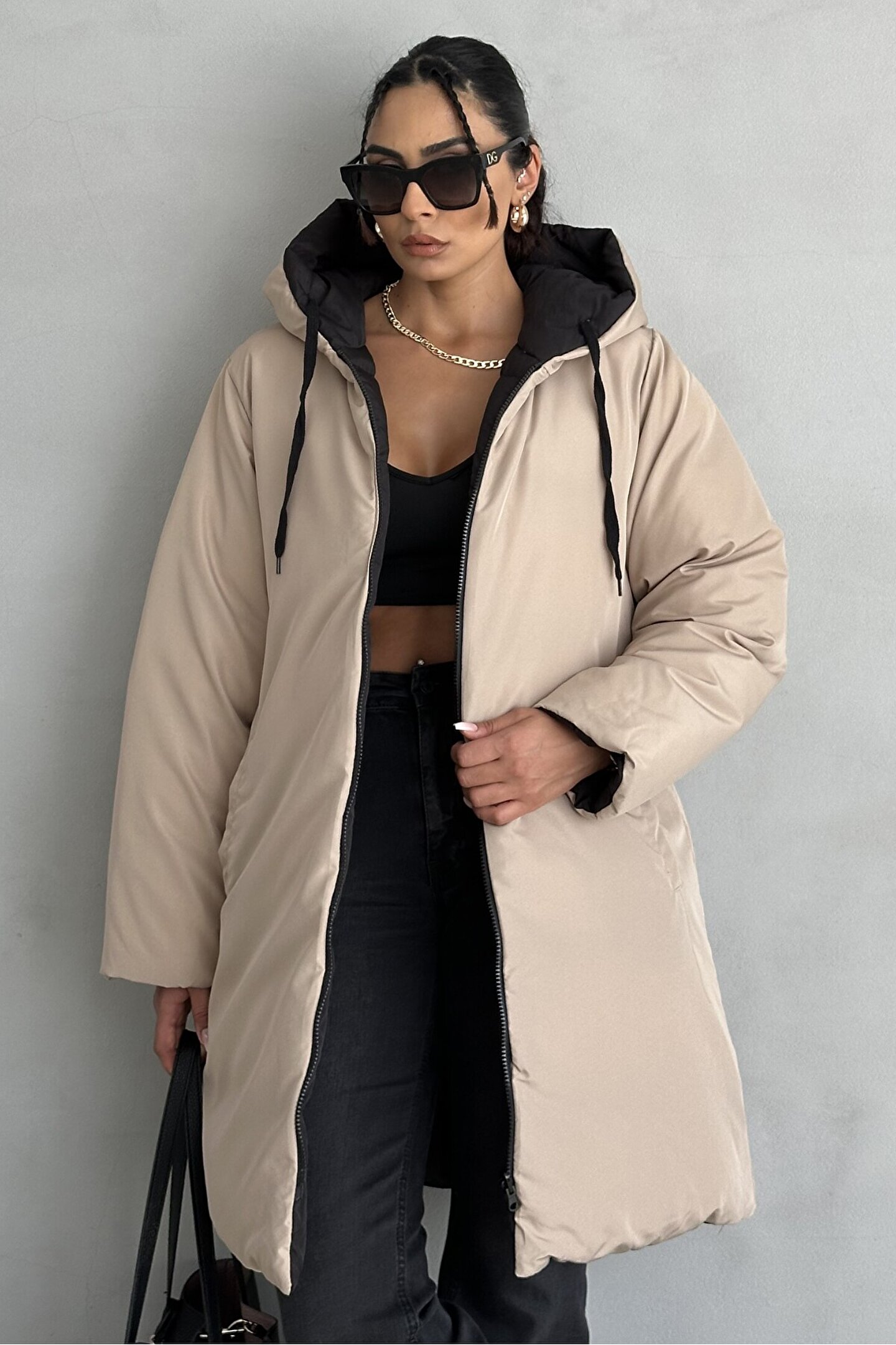Bir yüzü bej, diğer yüzü siyah olan mont sayesinde tek ürünle iki farklı stil yaratabilirsiniz.