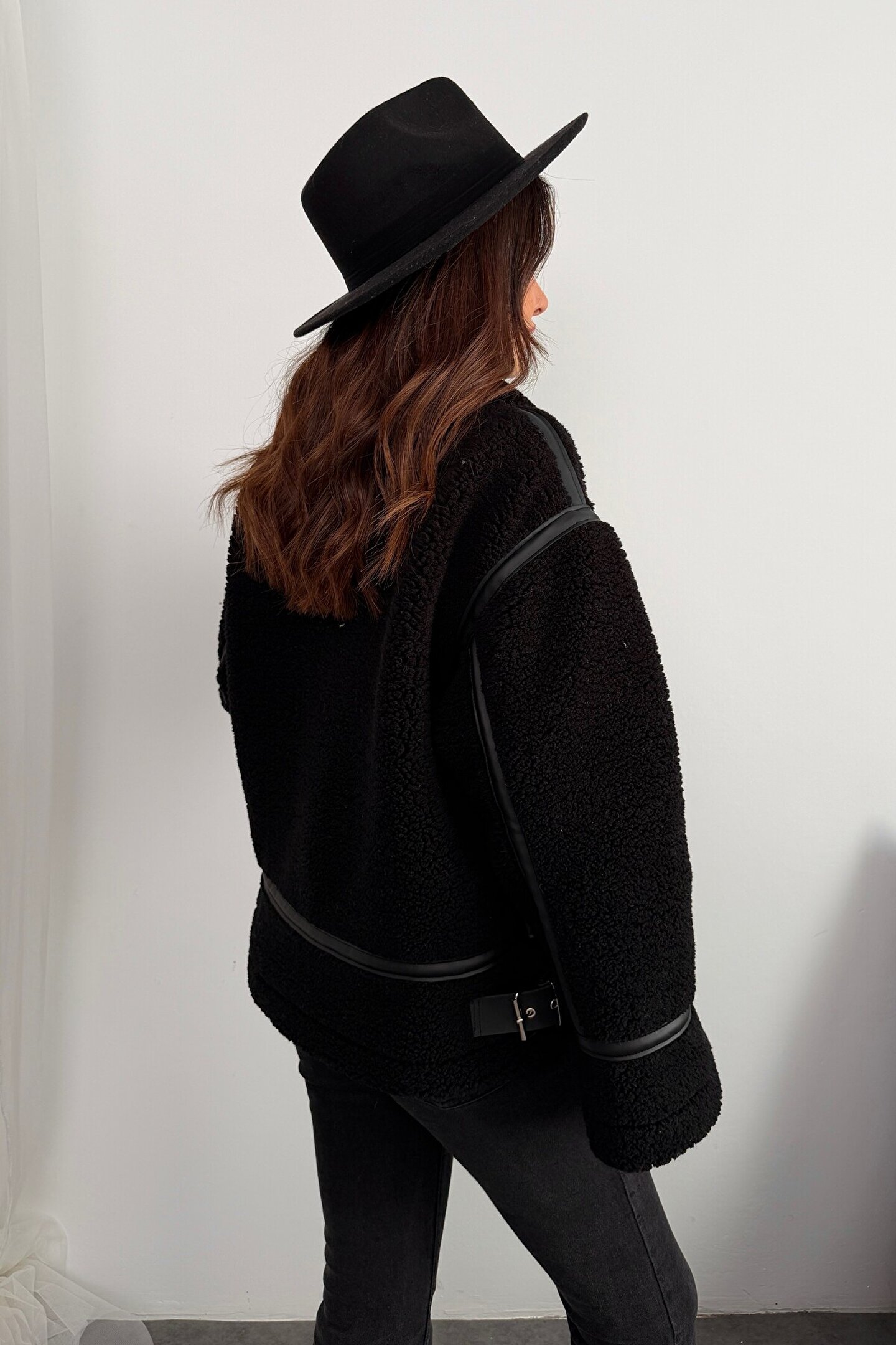 moda armanc Kadın Deri Detaylı Oversize Peluş Mont - Premium Tasarım Biker Teddy Kaban Ceket