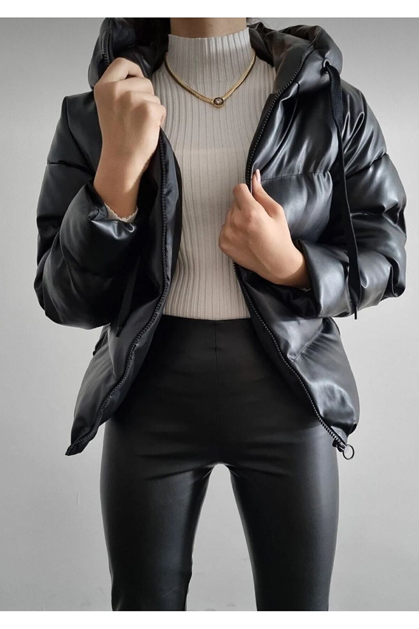moda armanc Kadın Deri Kapüşonlu Siyah Şişme Mont