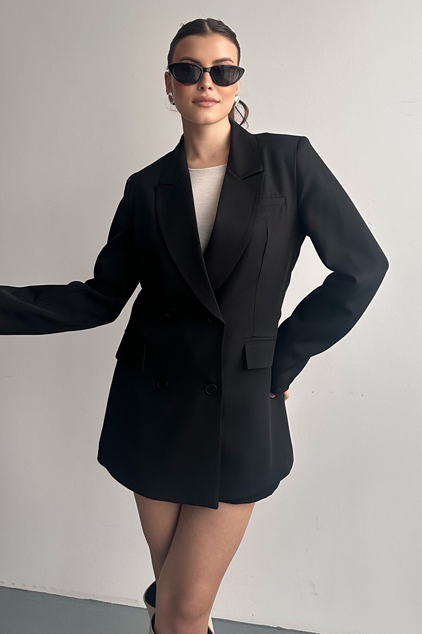 • Kruvaze düğme detayı sayesinde klasik blazer görünümünü modern bir duruşla tamamlar.