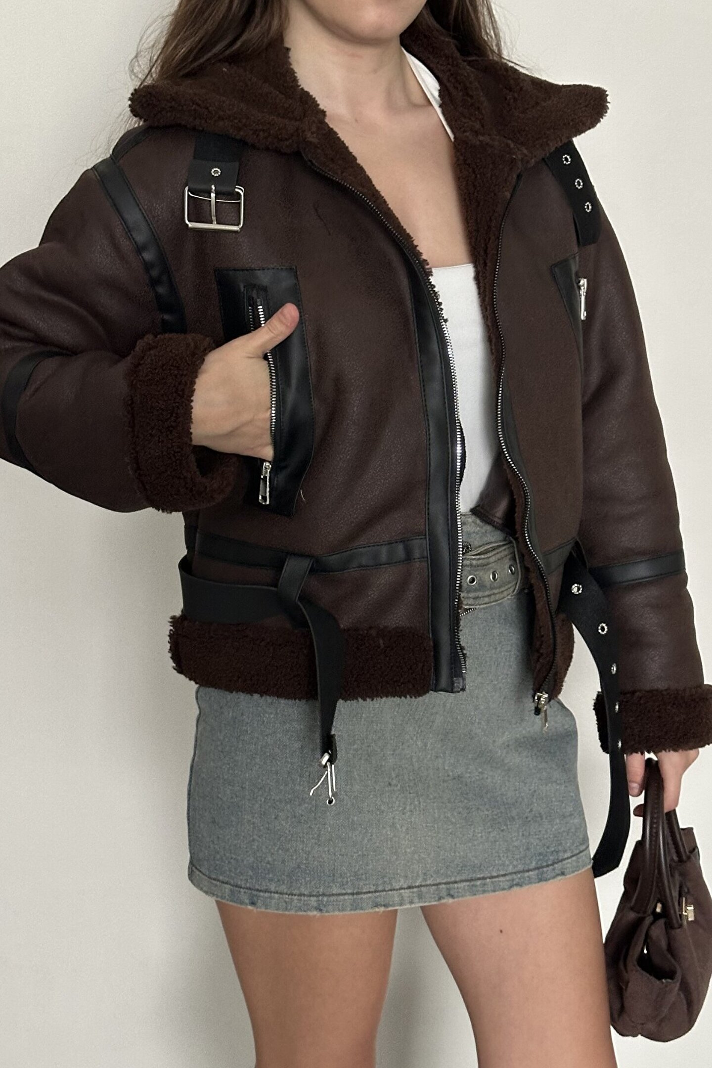 • İçi tamamen kürklü yapısı, kemer ve fermuar detaylarıyla aviator/biker tarzını günlük kombinlerine taşıyor.