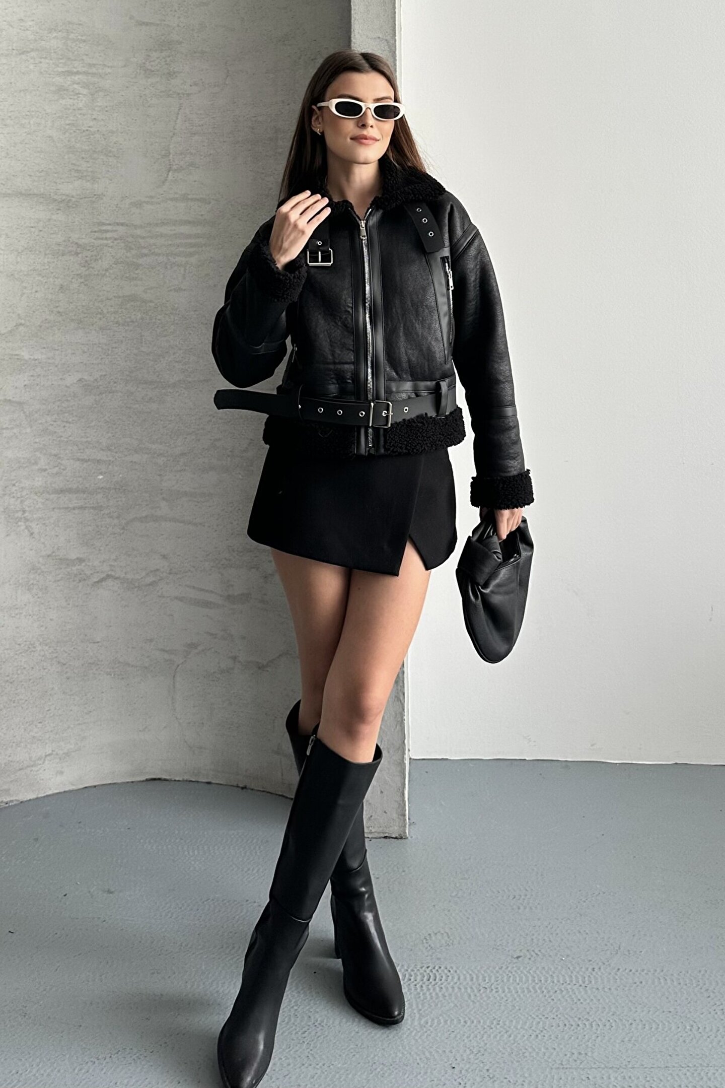 • İçi tamamen kürklü yapısı, kemer ve fermuar detaylarıyla aviator/biker tarzını günlük kombinlerine taşıyor.
