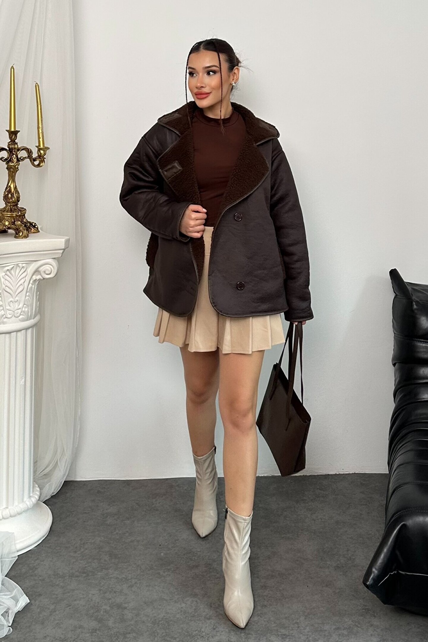 moda armanc Kadın İçi Peluş Kürklü Oversize Suni Deri Mont - Else Lamine Süet Ceket