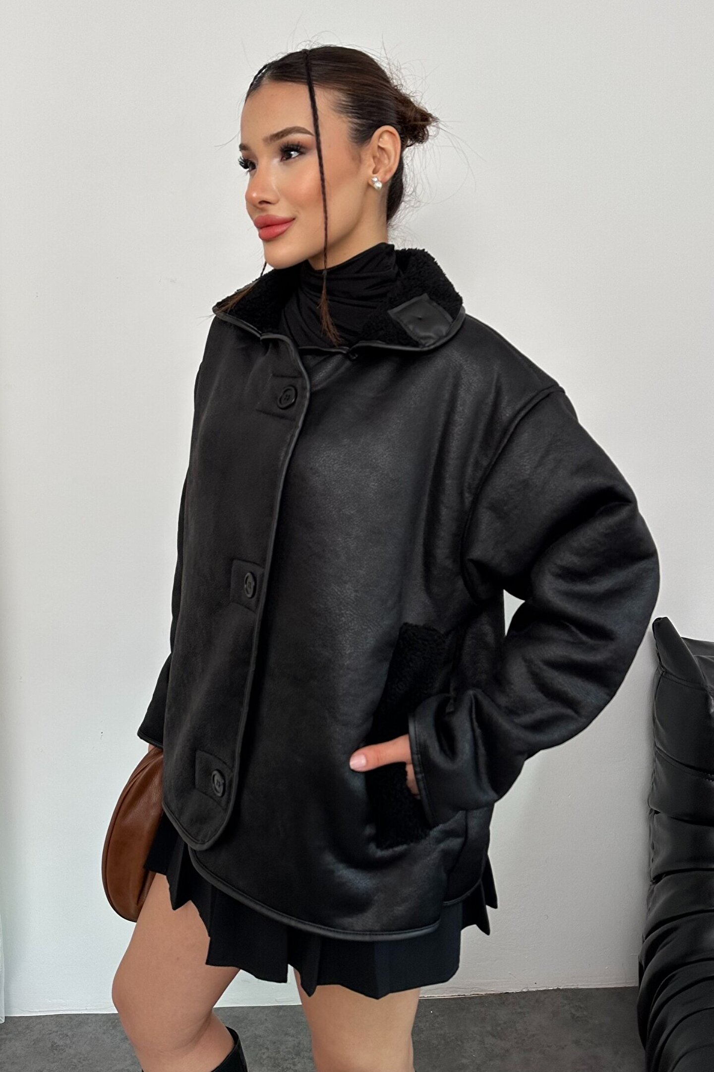 moda armanc Kadın İçi Peluş Kürklü Oversize Suni Deri Mont - Else Lamine Süet Ceket