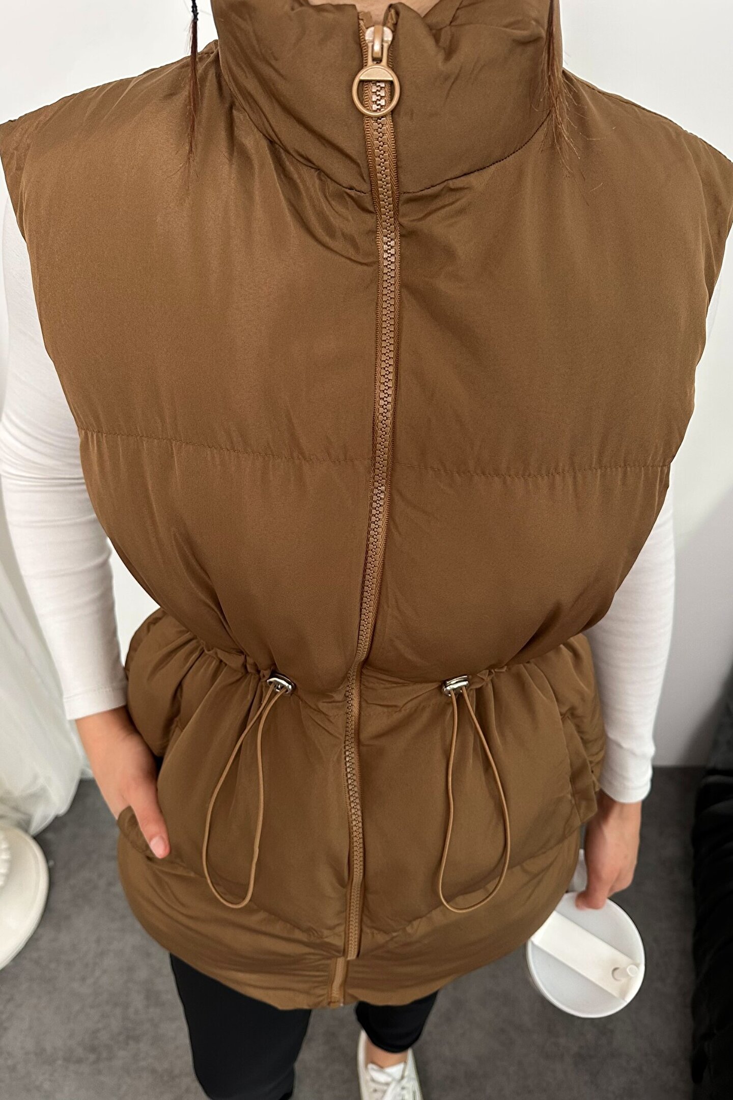 moda armanc Kadın Kahverengi Şişme Yelek - Fermuarlı Cepli Spor Şişme Mont Yelek