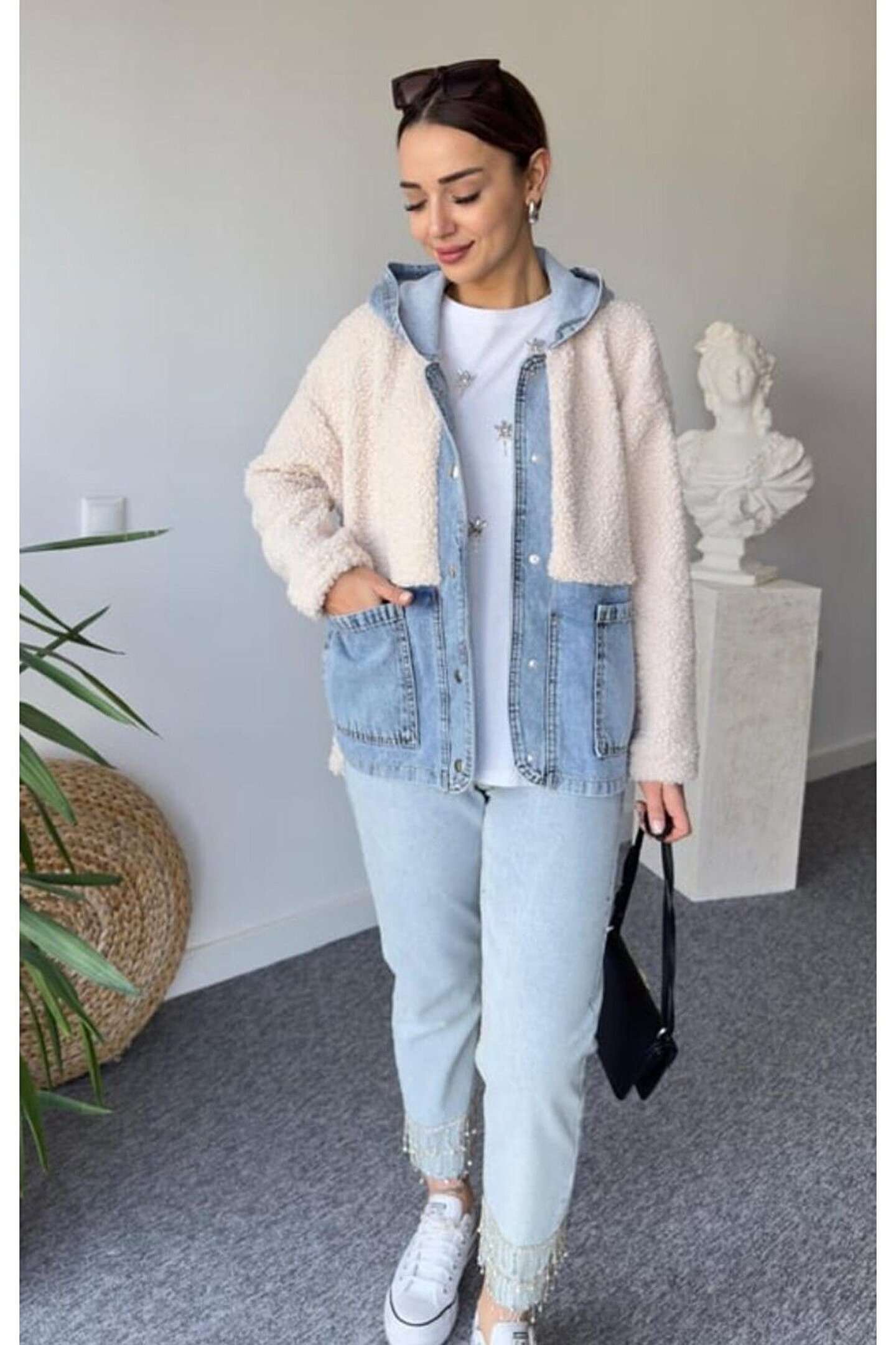 Kadın Kapüşonlu Denim Detaylı Peluş Ceket