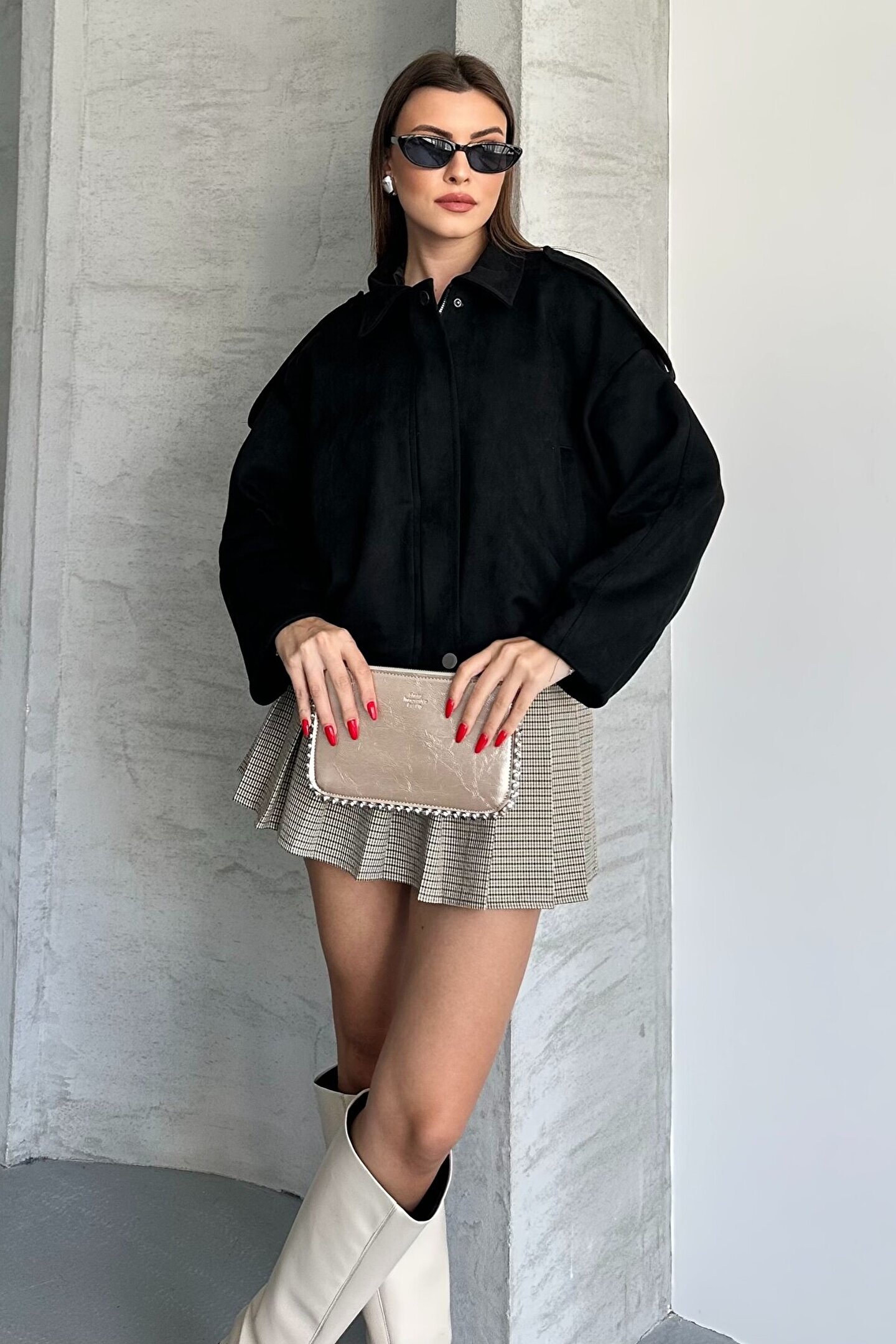 • Oversize kesimi ve yumuşak süet kumaşı ile bu kadın ceket, hem şıklığı hem konforu bir arada sunuyor.