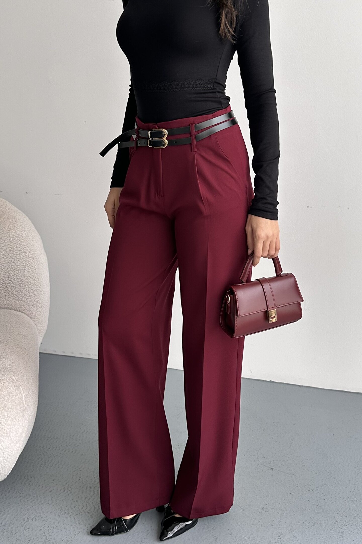 moda armanc Kadın Palazzo Pantolon Kemerli | Yüksek Bel Bol Paça Günlük Çift Kemerli Tasarım