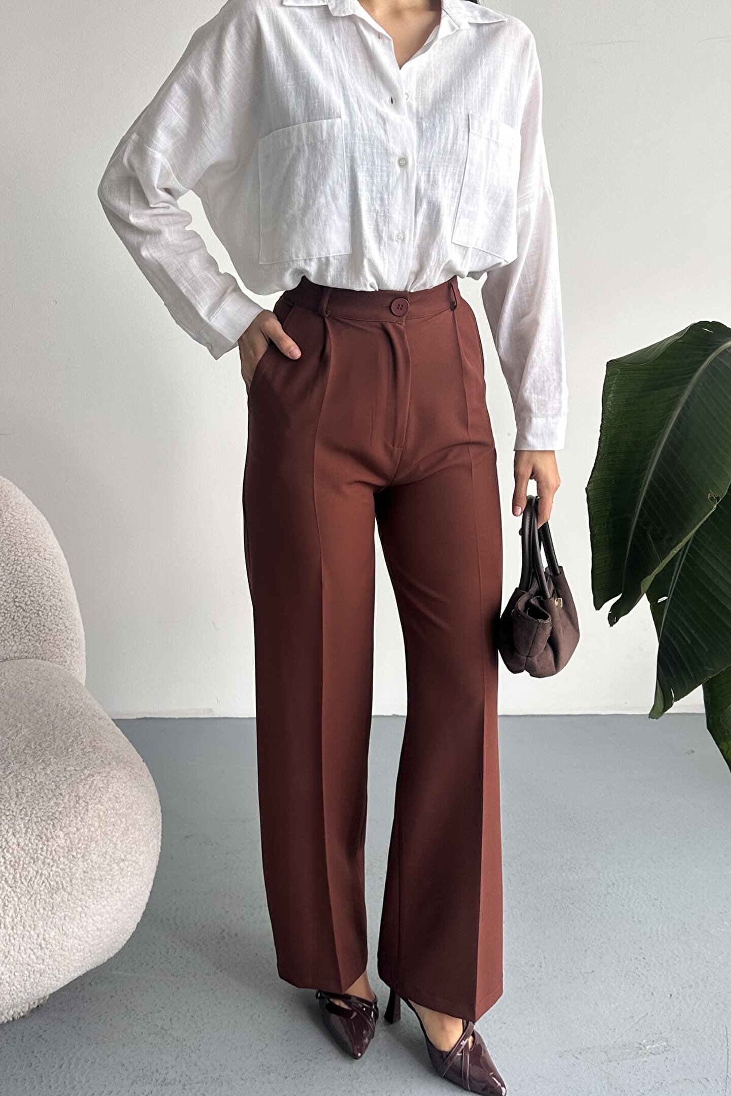 Kadın Palazzo Pantolon; Modern kesimi ve yüksek bel formuyla hem ofis hem günlük kombinlerin vazgeçilmez şık pantolon modeli.; ; Zamansız stil anlayışını modern kesimle buluşturan yüksek bel geniş paça kumaş pantolon, hem günlük kombinlerde hem ofis stilinde şık ve güçlü bir görünüm sunar.; ; Yüksek bel tasarımı vücut formunu dengelerken, akıcı ve düz paça kesimi bacak boyunu daha uzun ve zarif gösterir.; ; Minimal ve sade görünümü sayesinde farklı üst parçalarla kolayca kombinlenebilir.; ; Günlük kullanımda crop, basic tişört ve gömleklerle modern bir stil oluştururken, blazer ve topuklu ayakkabı ile klasik ofis şıklığına uyum sağlar.; ; Akıcı yapısı gün boyu konfor sunarken, güçlü silueti sayesinde stil sahibi ve modern bir duruş kazandırır.; ; Yüksek bel toparlayıcı form ; İspanyol paça modern kesim ; Akıcı ve rahat kumaş yapısı ; Günlük, ofis ve şehir stiline uygun ; Kolay kombinlenebilir zamansız tasarım ; Şık ve dengeli siluet görünümü ; Gardırobun en kurtarıcı parçalarından biri olacak bu model, hem klasik hem modern stil seven kadınlar için tasarlanmıştır.; ;