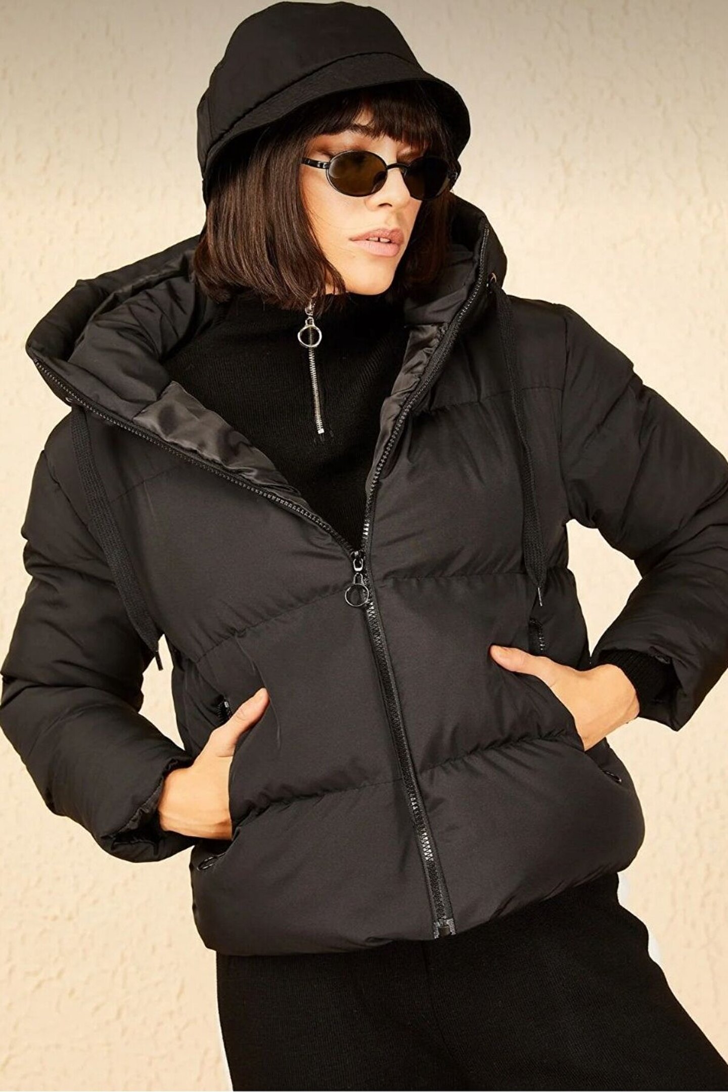 moda armanc Kadın Siyah Kapüşonlu Şişme Mont - Oversize, Yaka Bağcıklı