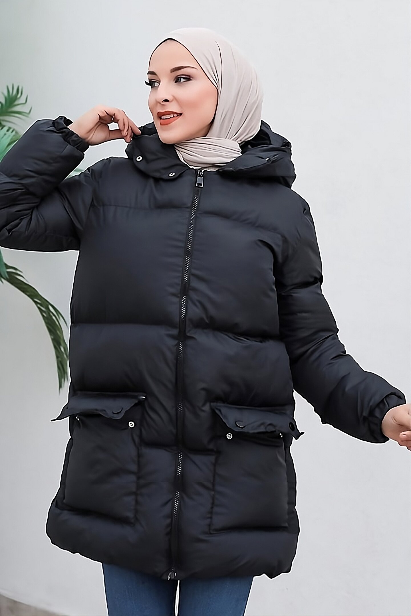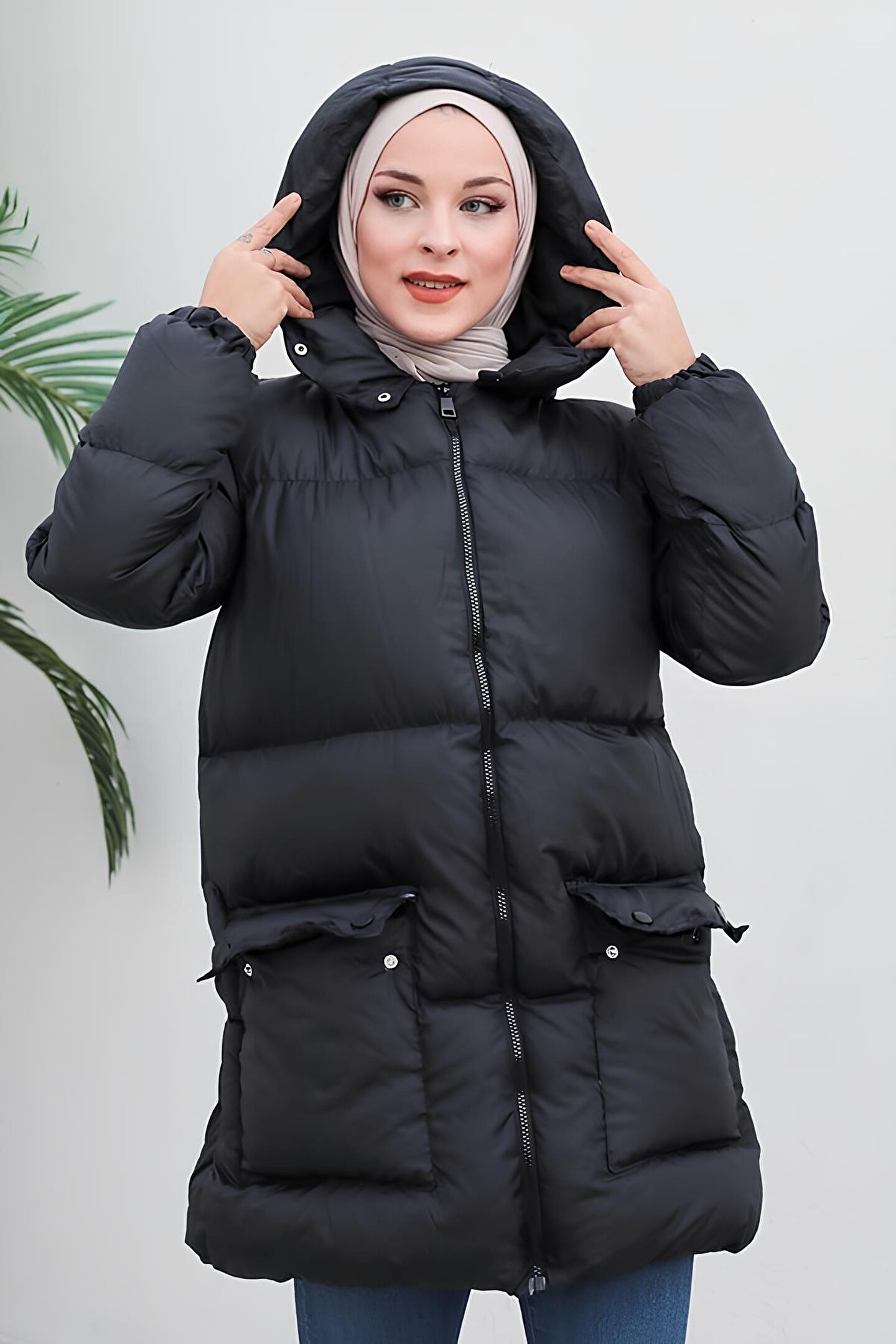 moda armanc Kadın Siyah Kapüşonlu Uzun Şişme Mont – Fermuarlı, Büyük Cepli, Kışlık Dolgulu Puffer Mont