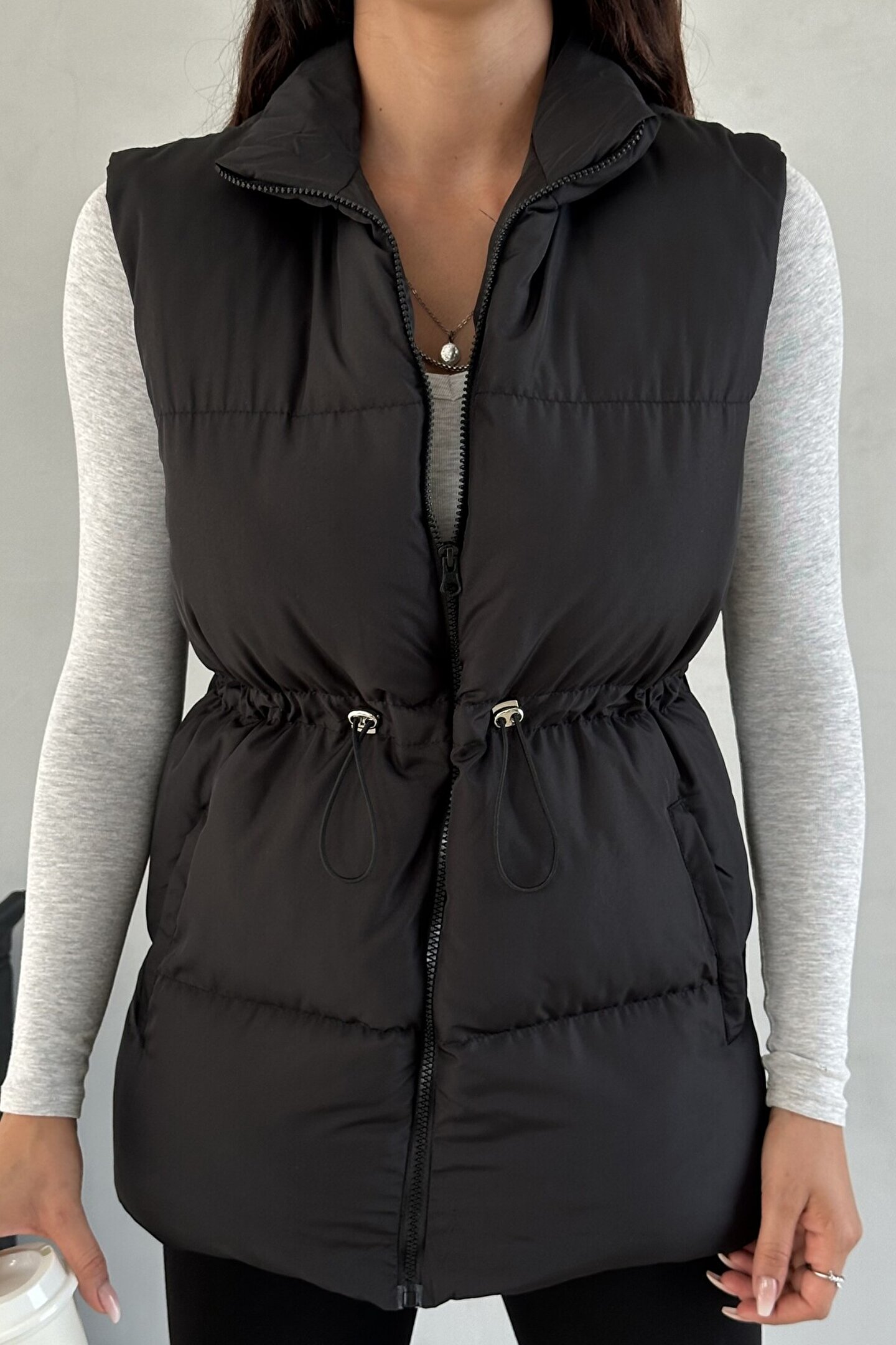 moda armanc Kadın Siyah Şişme Yelek - Kapüşonsuz Uzun Fermuarlı Cepli Kışlık Spor Şişme Mont Yelek