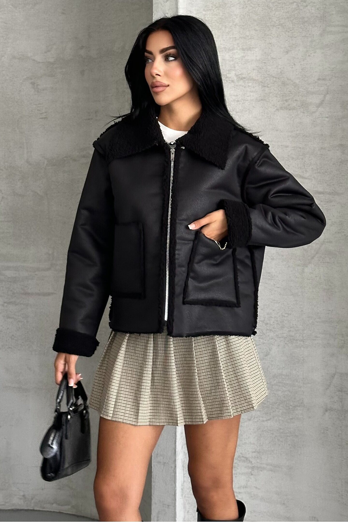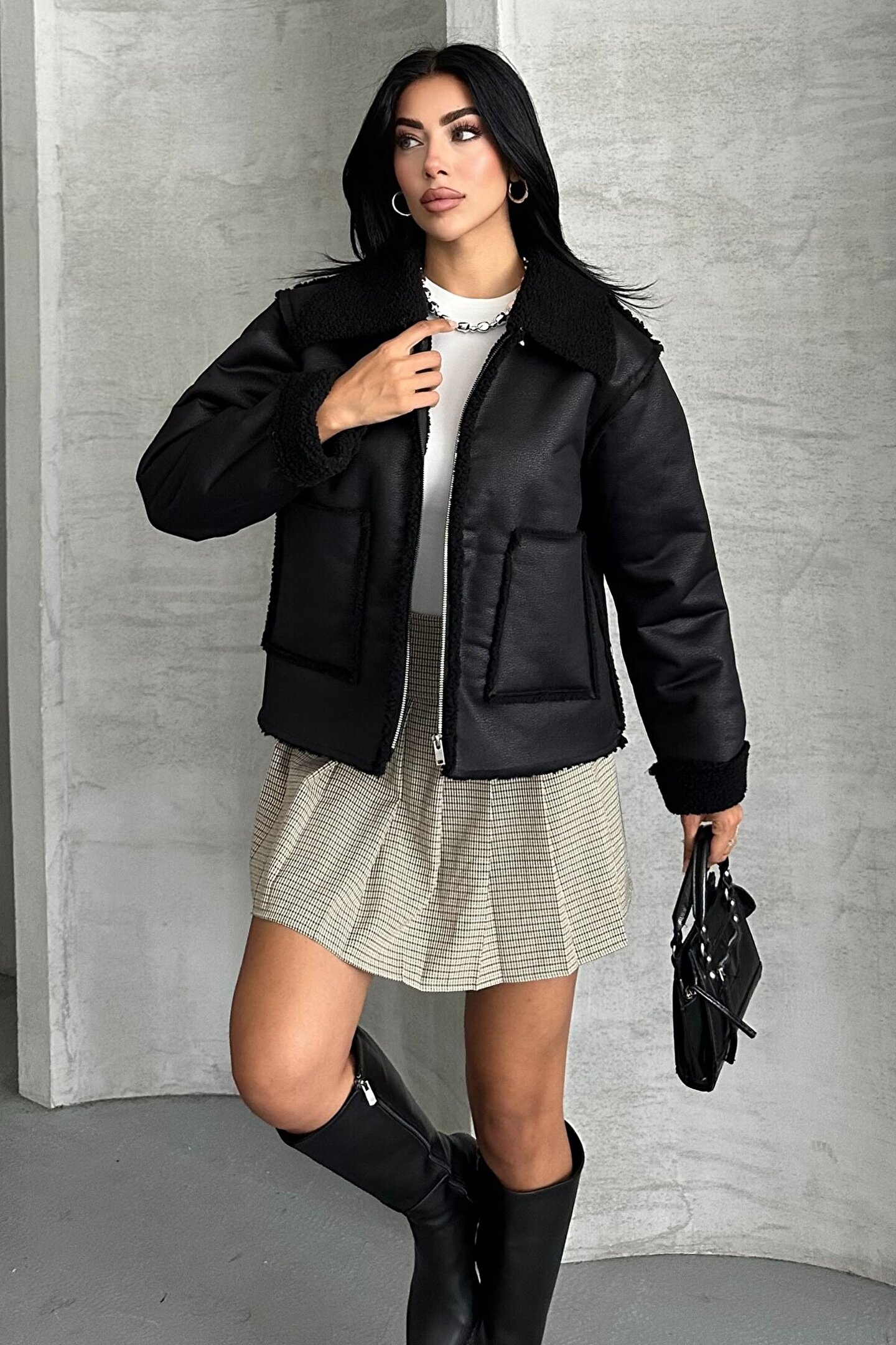 moda armanc Kadın Suni Deri Mont – İçi Peluş Astarlı, Kışlık, Çift Cepli, Siyah Biker Oversize Ceket