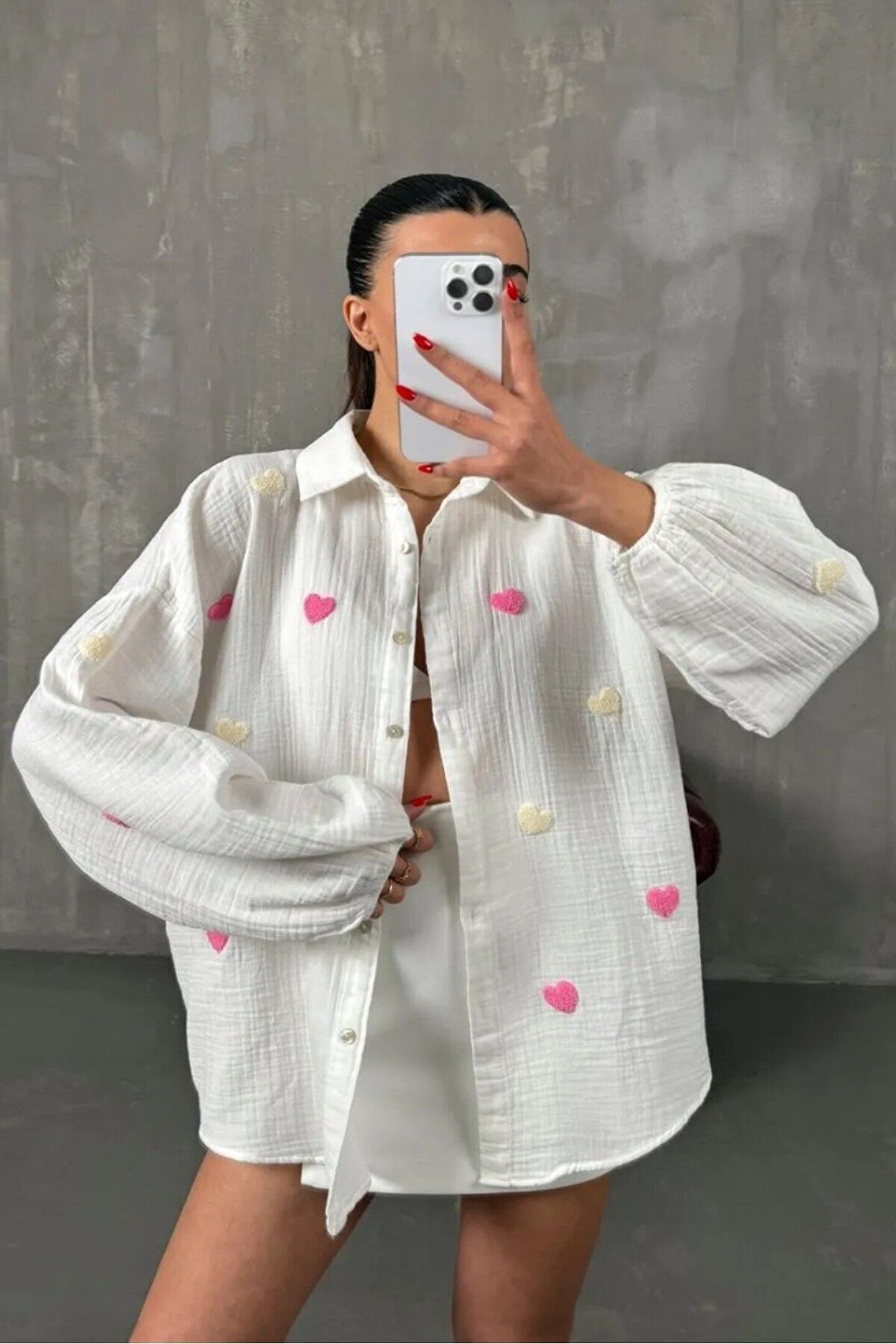 Kalp Nakışlı Müslin Kumaş Kadın Gömlek