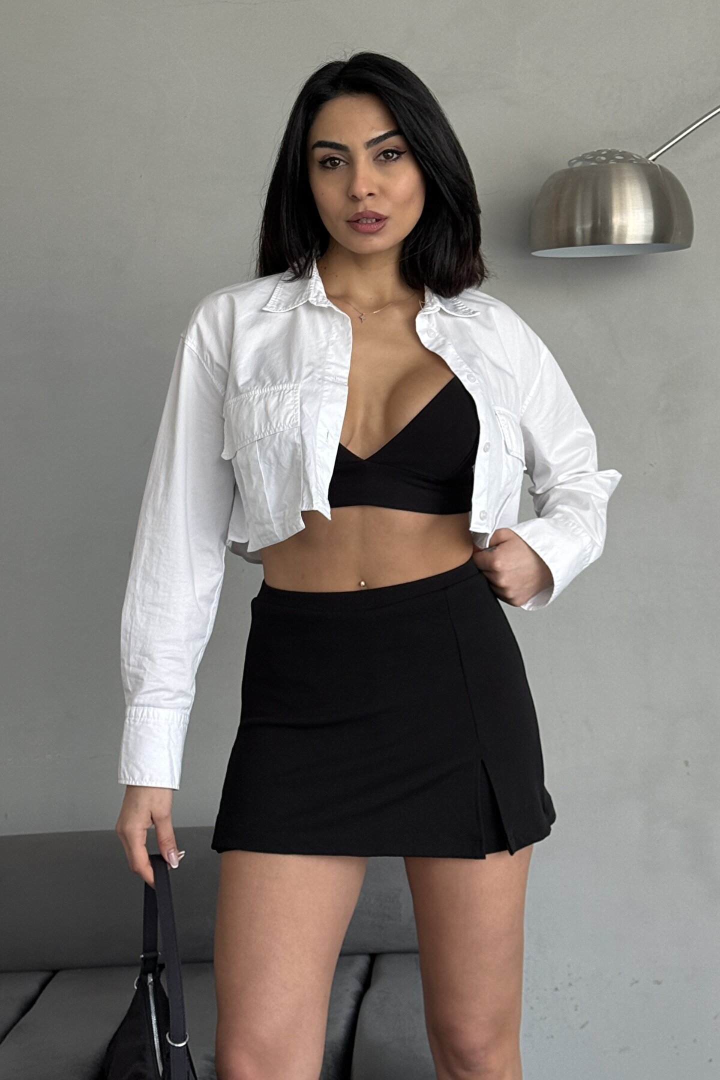 Model Ölçüleri: Boy: 172 Kilo: 58 (Modelin üzerindeki ürün S bedendir) ; Yaz sezonuna özel tasarlanmış siyah şort etek, günlük kullanım için idealdir.; ; Basic koleksiyonun sadeliğini yansıtan bu şort etek, her gardıropta temel parçalardan biridir.; ; Yıkama talimatlarına uygun şekilde bakım yapıldığında uzun ömürlü kullanım vaat eder.; ; Yırtmaç detayı sayesinde hareket özgürlüğü kazandırırken şık bir görünüm sunar.; ; Mini boy kesimiyle yaz aylarının vazgeçilmez parçası haline gelirken vücut hatlarını zarifçe sararak dikkat çeker.