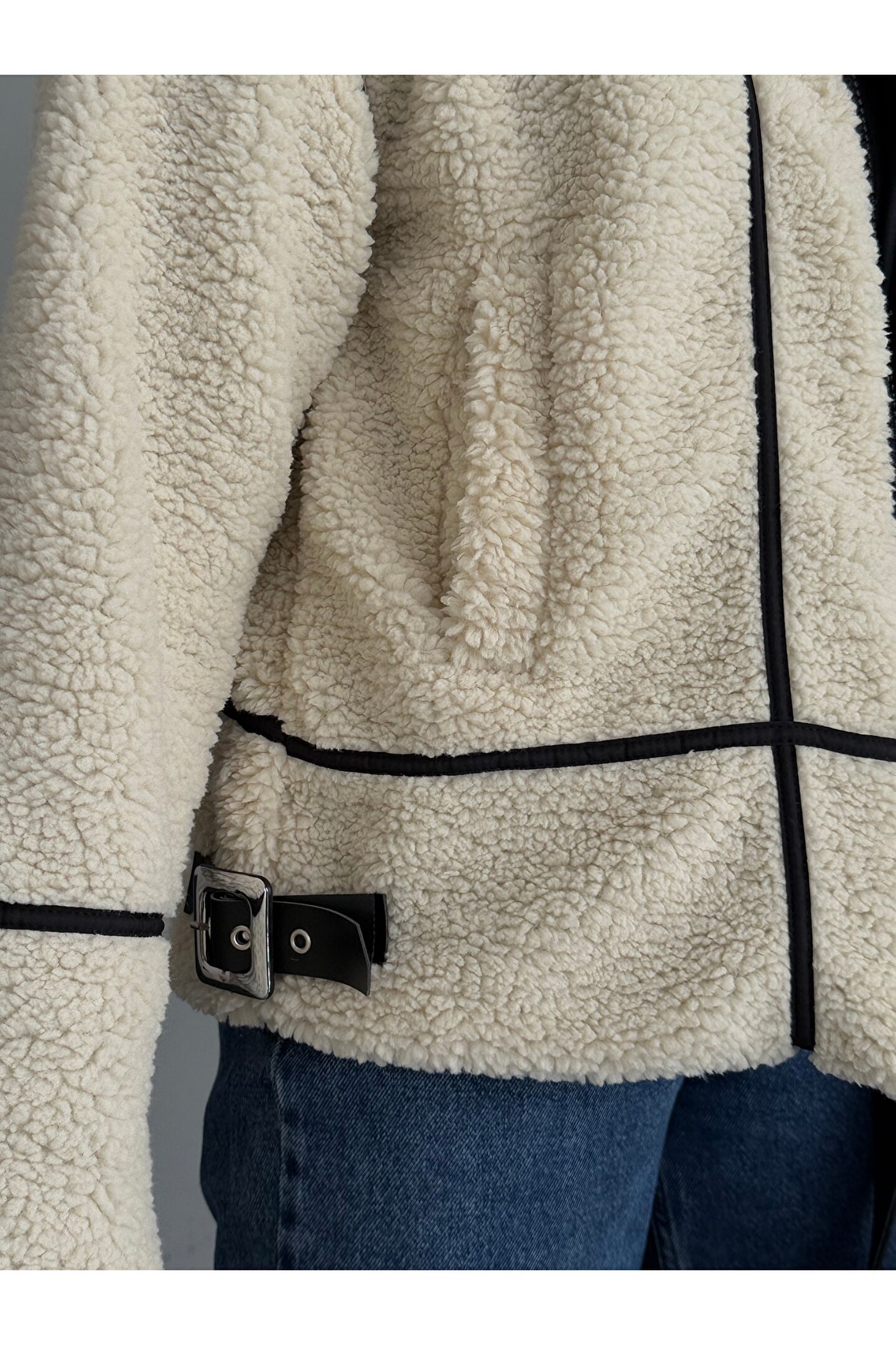 moda armanc Tasarım Detaylı Bej Peluş Kadın Mont