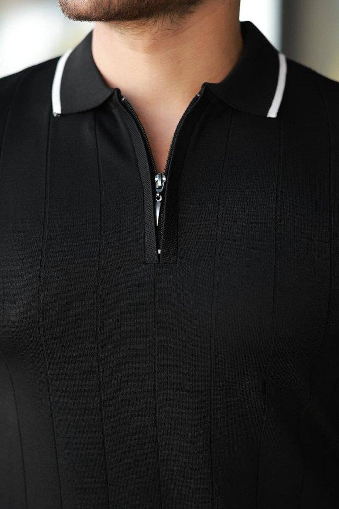 Erkek Fermuar Yakalı çizgi Dokulu Kısa Kollu Tişört