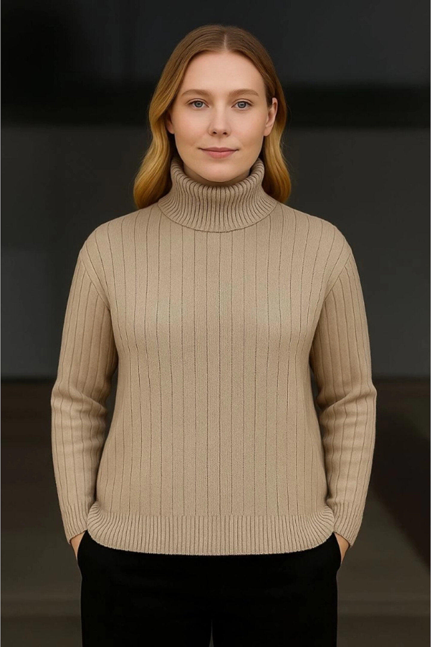 MODA Balıkcı Yaka Bağazlı Triko Kazak Pamuklu Kalın Fitilli Dokuma - Bej