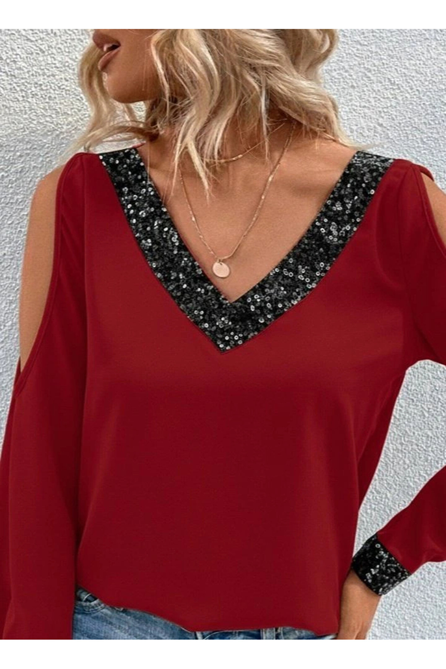 Moda Ebrar Kadın Uzun Kollu V Yakalı Omuzlardan Açık Sandy Bluz