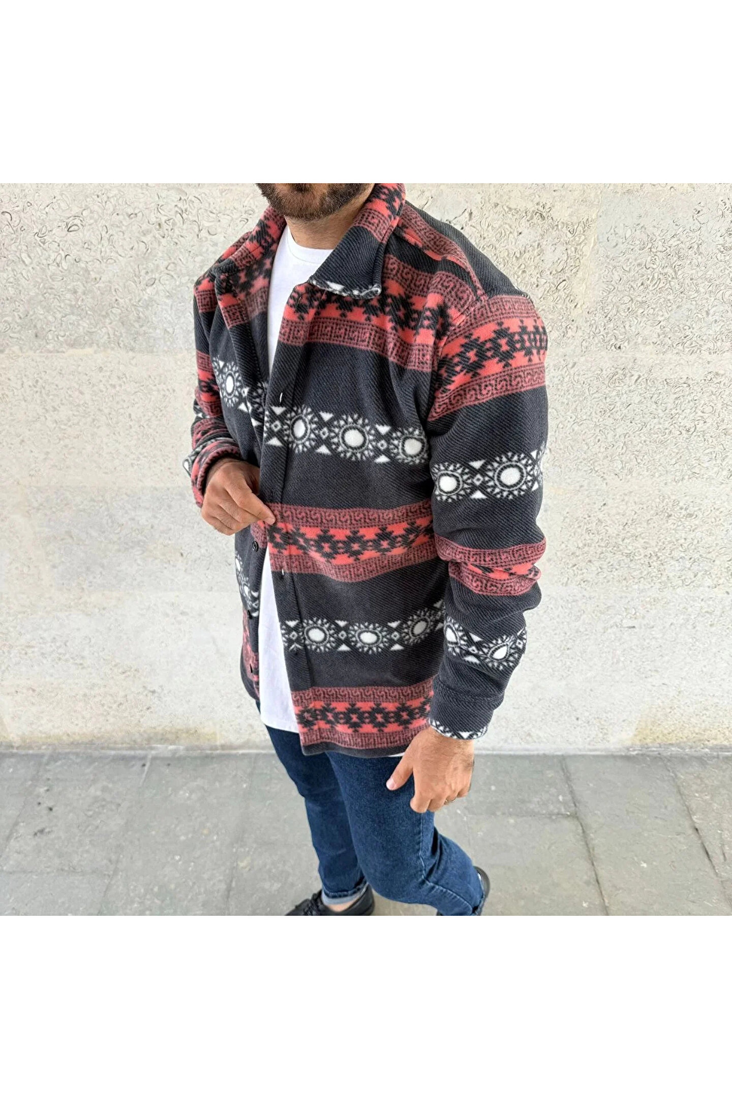 MODA Erkek Desenli Polar Gömlek – Etnik Şerit Desen Yakalı, Uzun Kollu, Düğmeli, Oversize Rahat Kalıp - F
