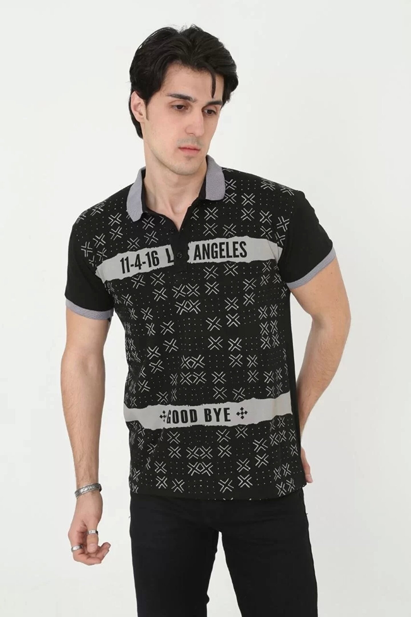 Erkek Yakalı Slim Fit Baskılı T-Shirt - Siyah