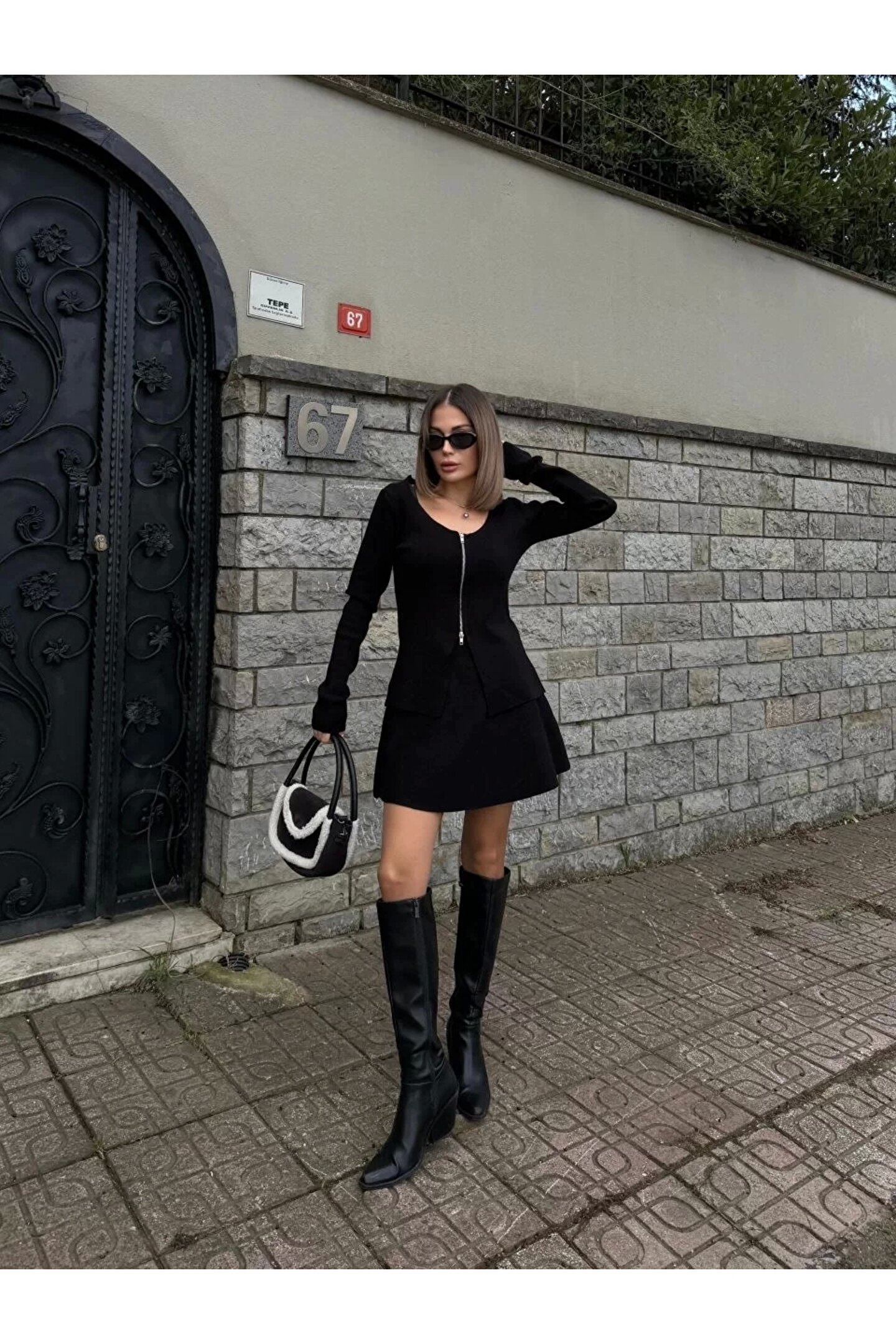 Bu kadın üst, bahar ve kış sezonlarına uygun olarak tasarlanmıştır.; Uzun kollu ve çift taraflı fermuarlı olan üst, açık yaka tasarımıyla şıklık sunarken, mini boyu ile modern bir görünüm elde edilmiştir.; Tam kalıp yapısı, vücuda oturan zarif bir siluet oluşturur.