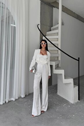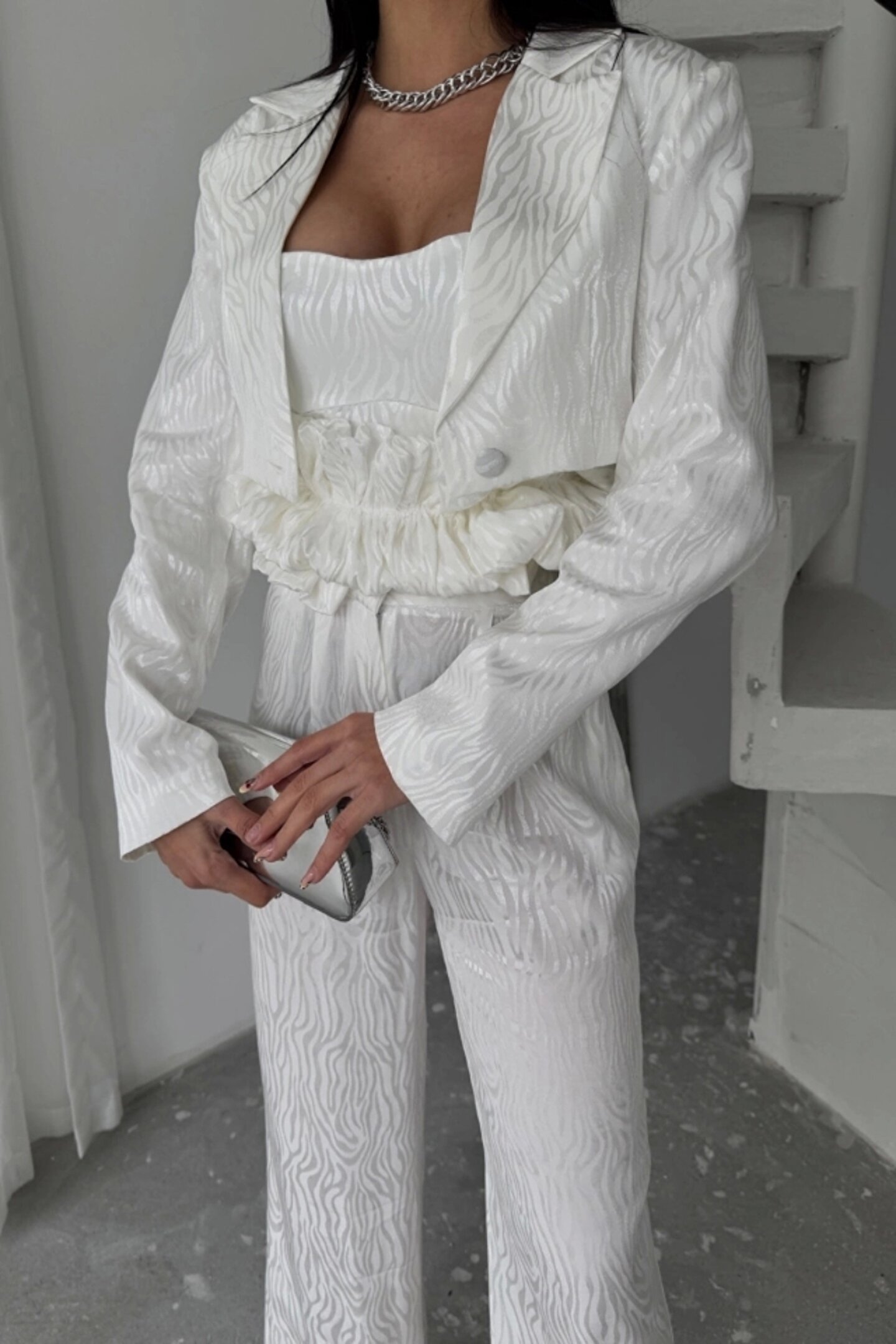 JAKARLI BLUZU TASARIM DETAYLI CEKET-PANTOLON-BLUZ 3 LÜ TAKIM - Beyaz