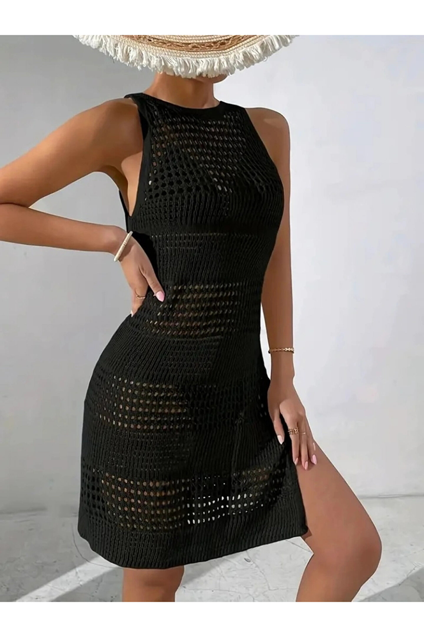 Kadın Askılı Derin Sırt Dekolteli Ajurlu Triko Pareo