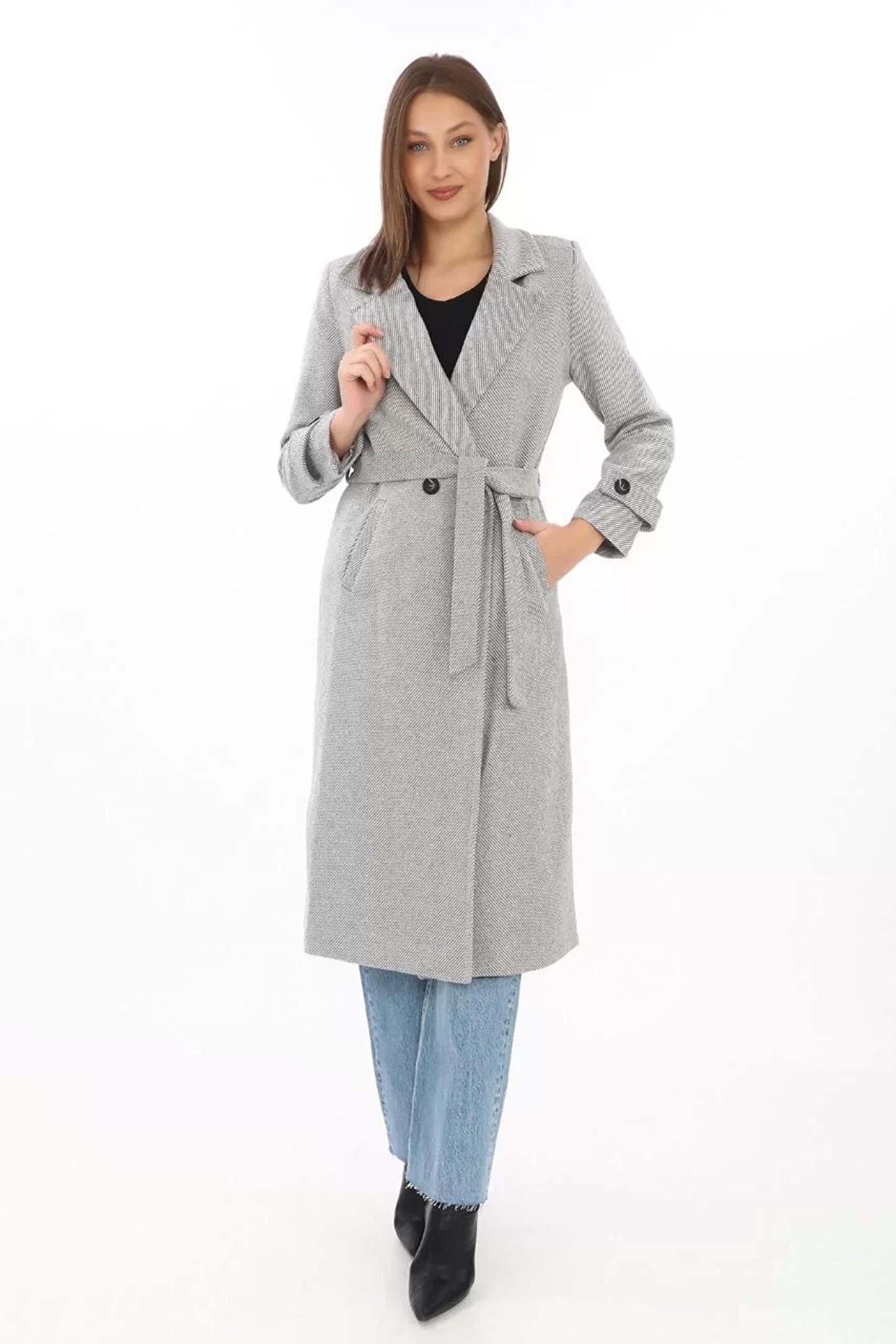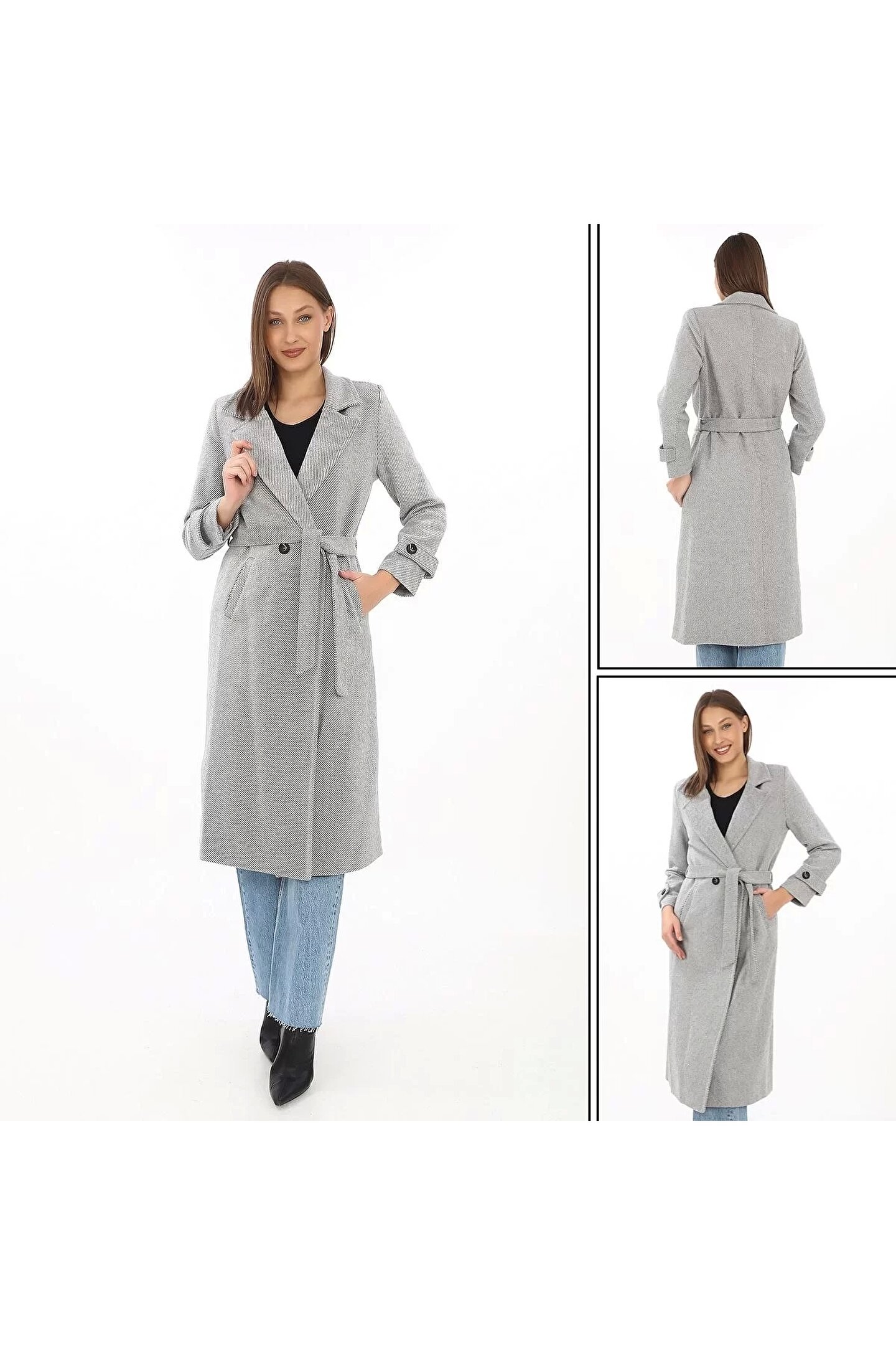 MODA Kadın Astarlı Balık Sırtı Kaşmir Kaşe Kaban - Gri