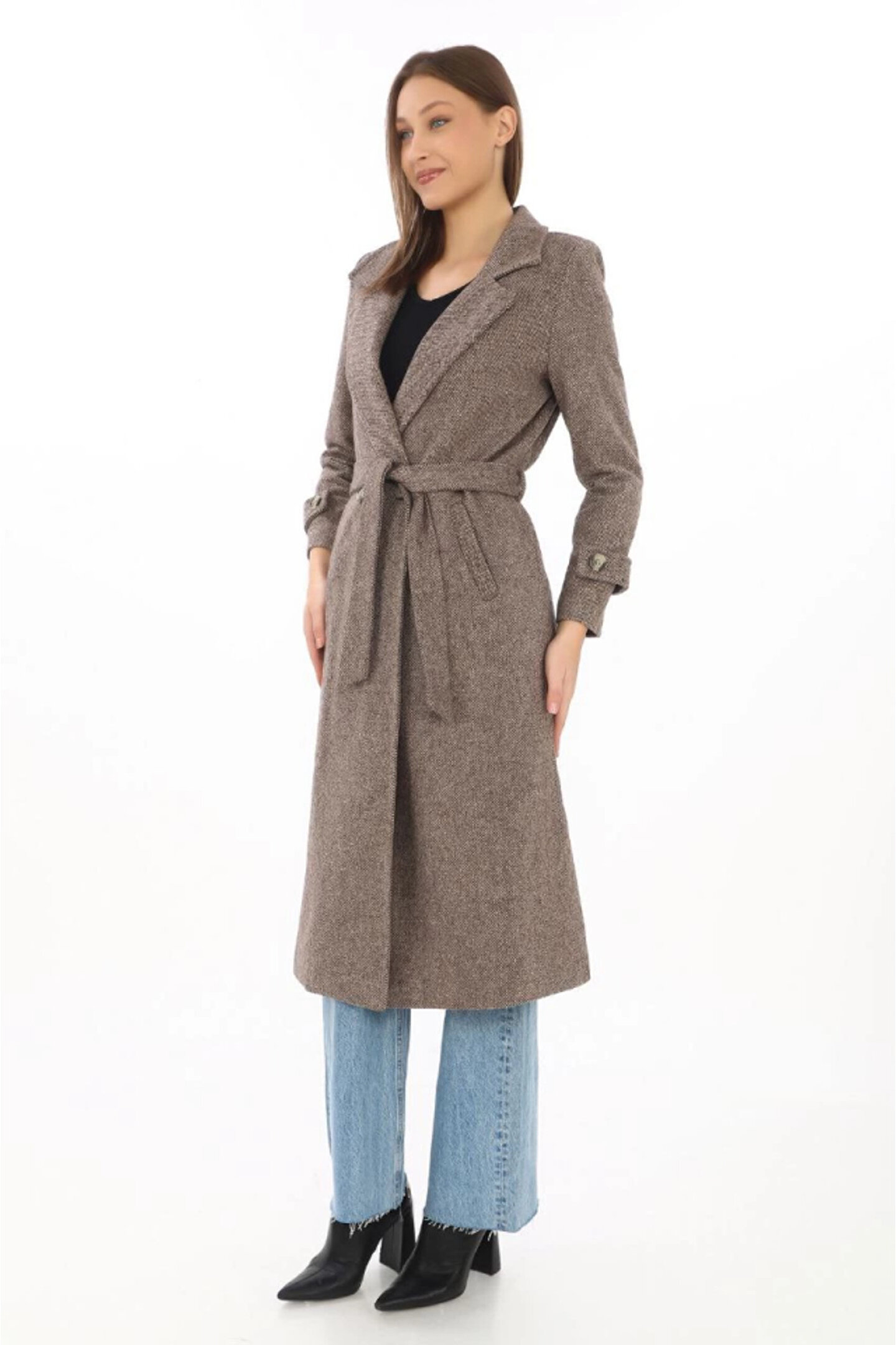 MODA Kadın Balık Sırtı Kaşe Kaban – Uzun Boy Kruvaze Yaka Kuşaklı Astarlı Kışlık Tesettür Kaban, Yünlü Do