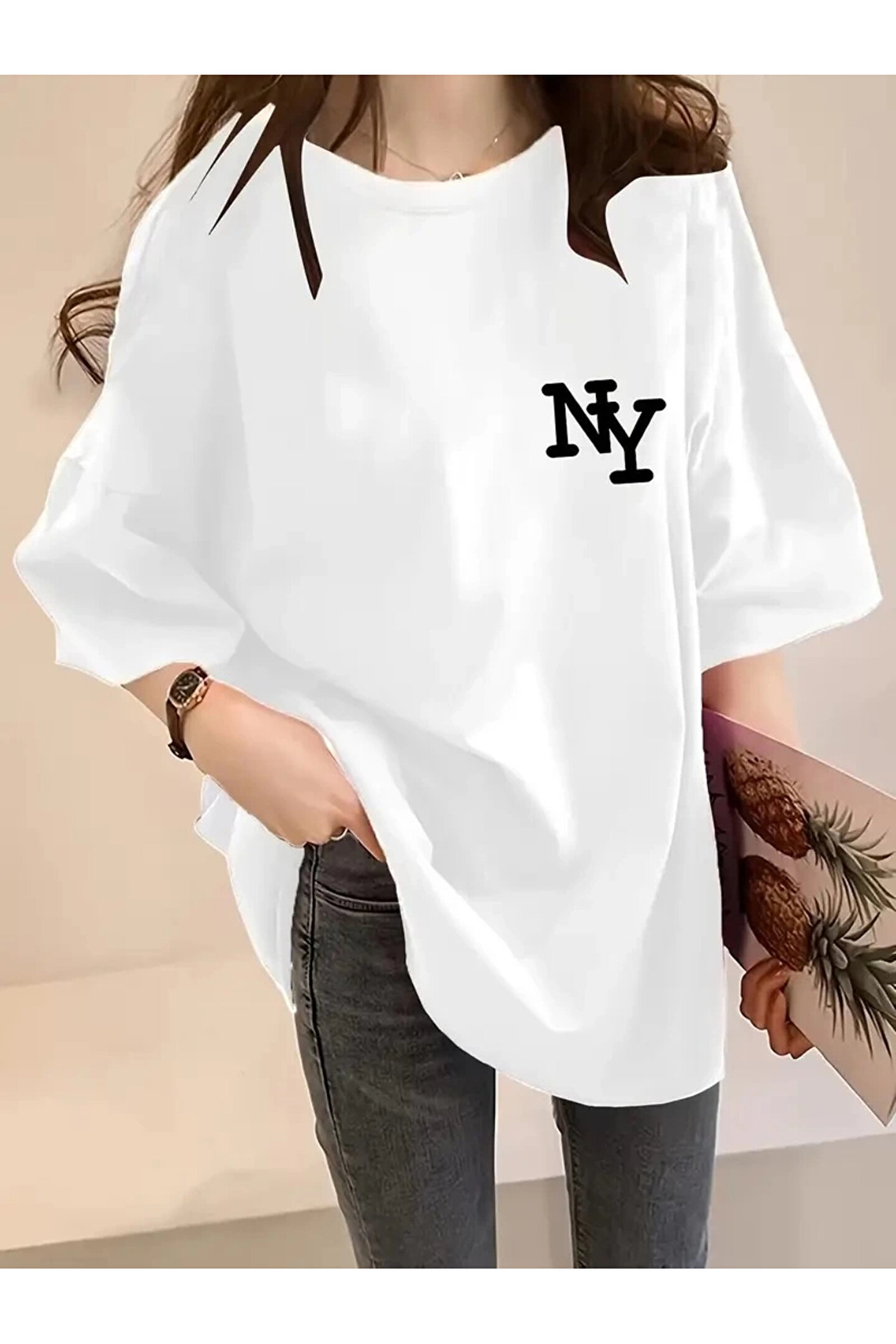 MODA Kadın Eğlenceli Harf NY Baskılı Bisiklet Yaka Tişört - Rahat Polyester, Makinede Yıkanabilir - Yaz v