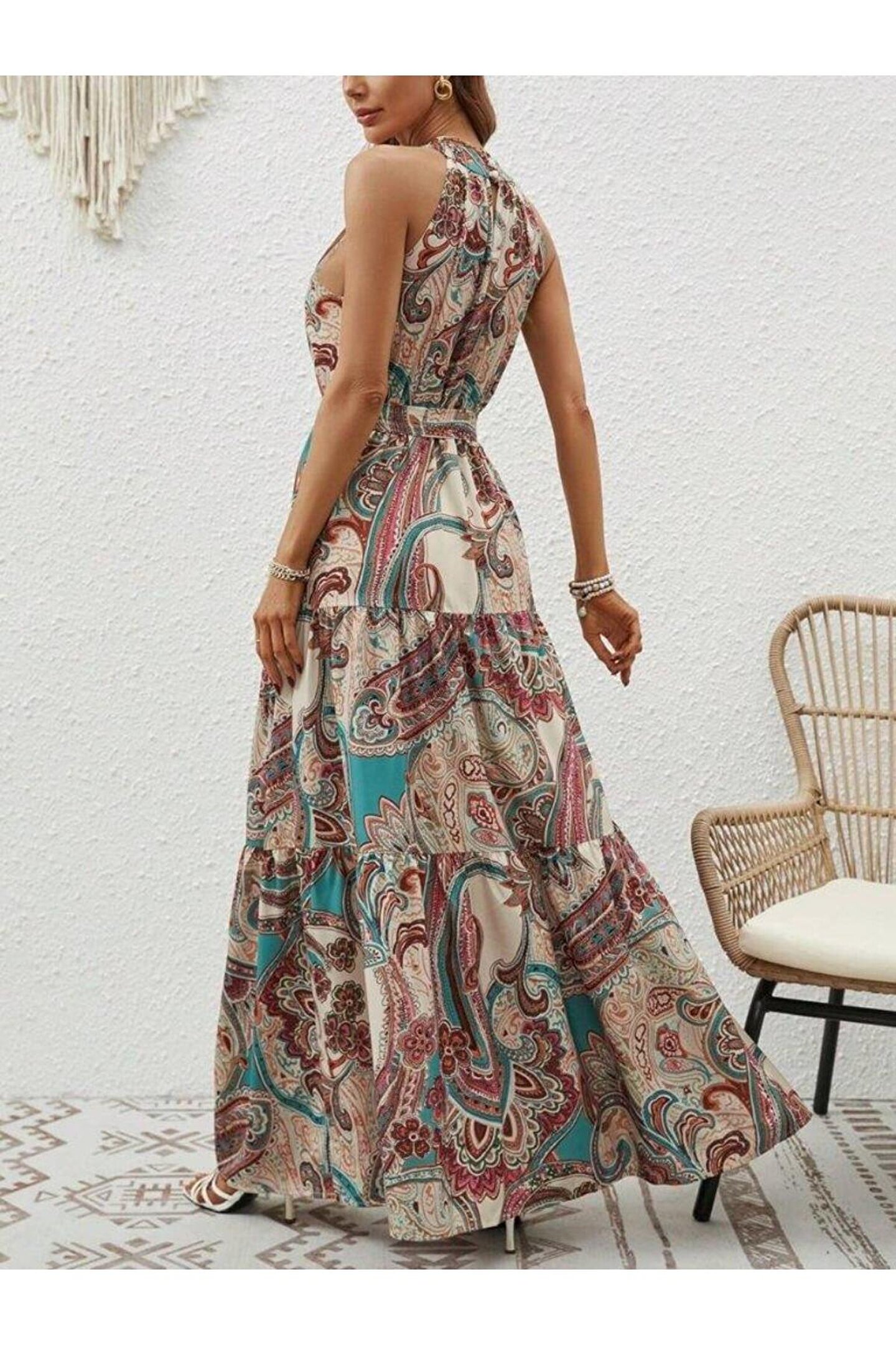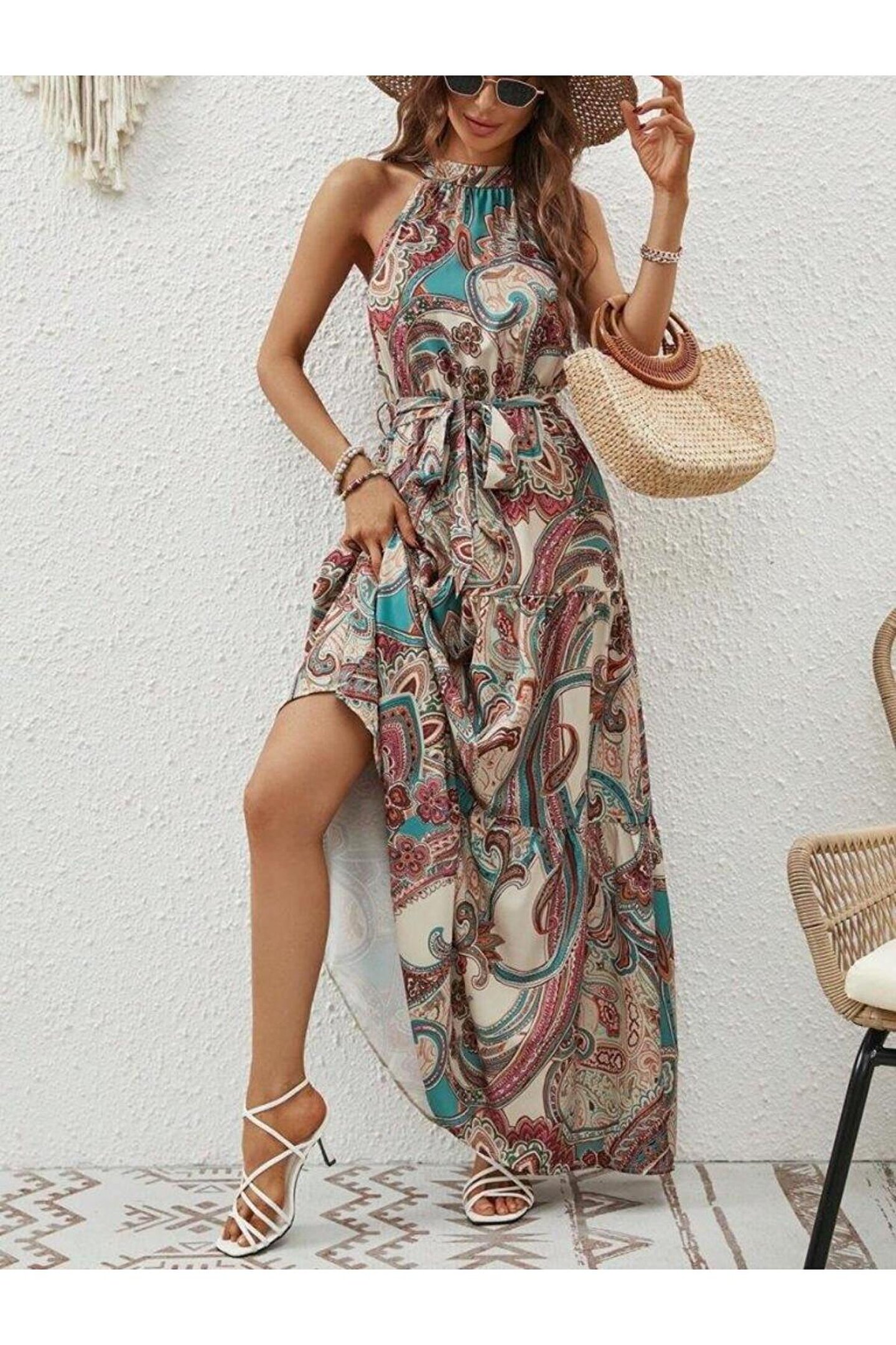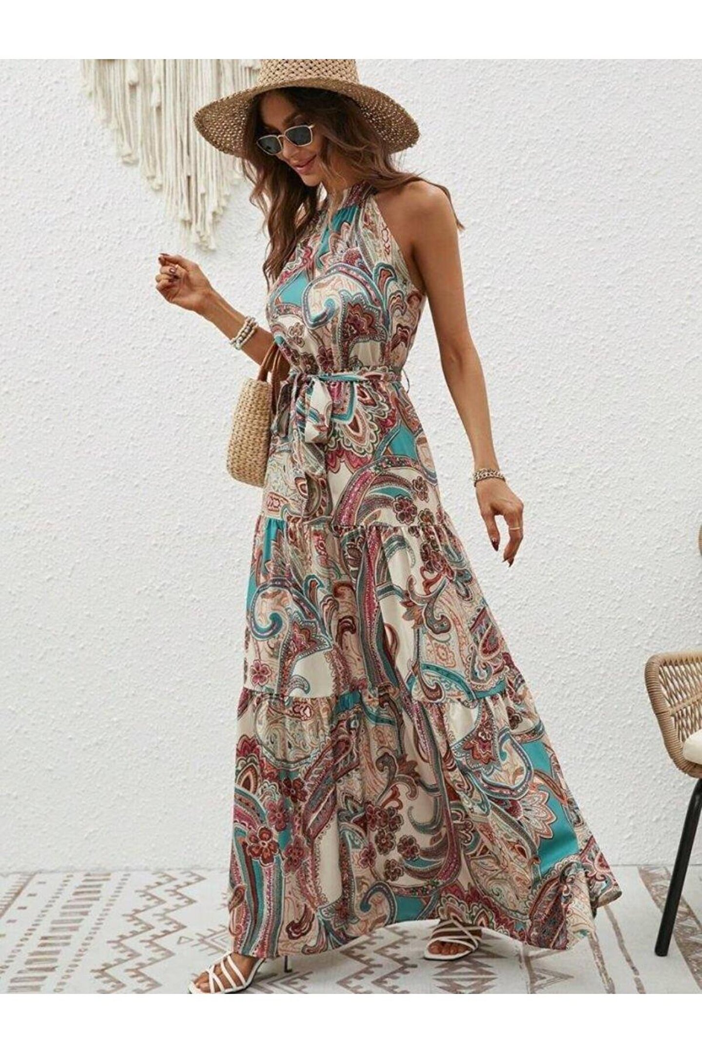 - Yaz aylarının vazgeçilmez parçası, hafif ve nefes alabilen süprem kumaştan üretilmiştir.; - Omuzları açık tasarımı ile modern ve şık bir görünüm sunar.; - Kuşak detayı sayesinde belinizi vurgulayarak feminen bir siluet oluşturur.; - Astarsız yapısı ile hafiflik hissi verir ve rahat hareket etme özgürlüğü sağlar.; - Cepsiz tasarımı pratik kullanım sunarken, minimalist tarzını korur.; - Günlük giyime uygun casual koleksiyonun parçasıdır; rahatlığı ve şıklığı bir arada sunar.; - İnce dokusuyla yaz sıcaklarında serinlik sağlar ve hafifliğiyle konforlu bir deneyim yaşatır.; - Örme kumaş tipi sayesinde esnek yapıda olup vücut hatlarınıza mükemmel uyum sağlar.; - Trend bir görünüm kazandıran deseni ile stil sahibi kombinler oluşturmanıza olanak tanır.; - Omzu açık kol tasarımı ile zarif ve sofistike bir tarz yaratırken aynı zamanda trendleri takip etmenizi sağlar.; - Halter yakası sayesinde dekolte bölgesini zarifçe sergilerken feminen detaylardan ödün vermez.