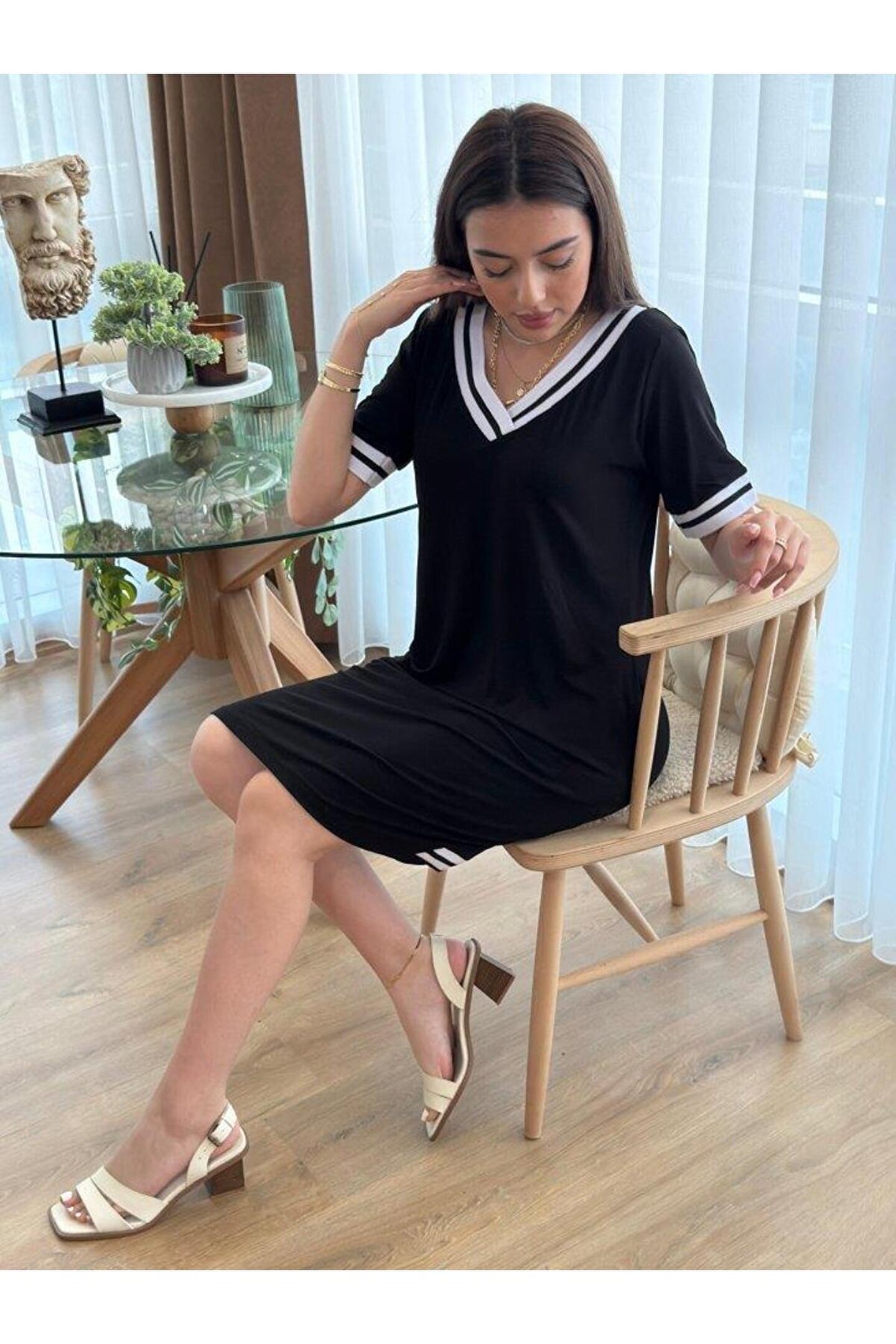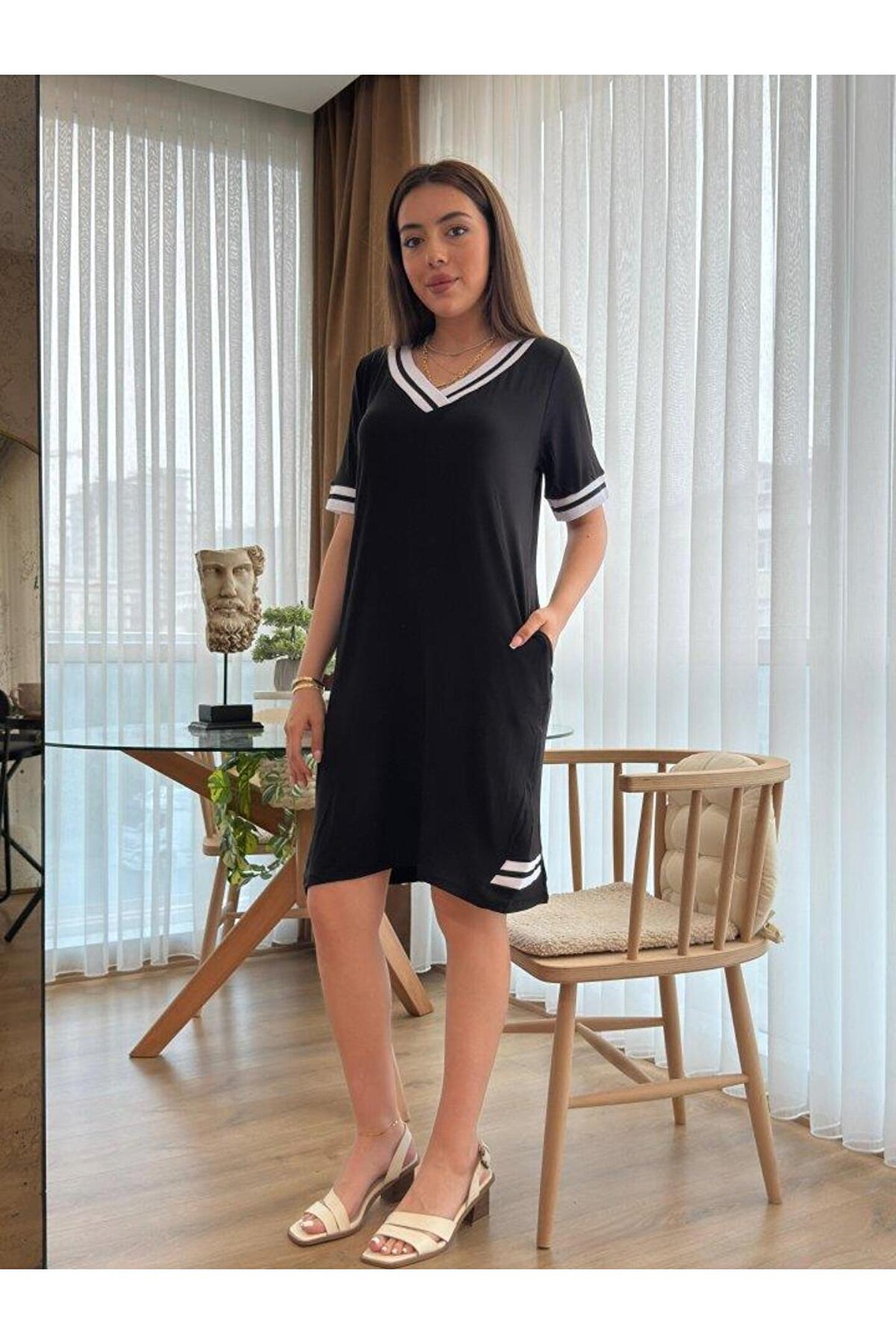 Kadın Kısa Kollu V Yaka Ribana Detaylı Cepli Dizüstü Viskon Elbise