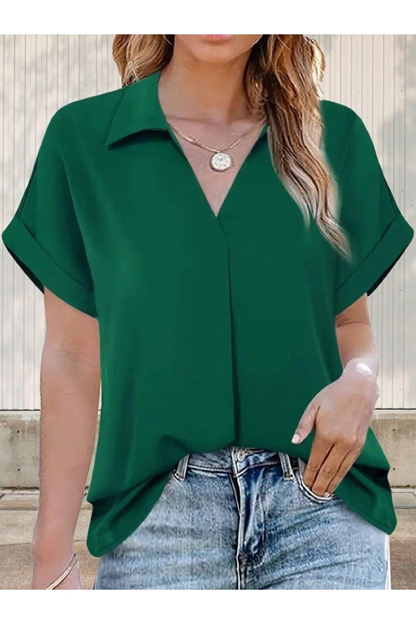 Kadın Kısa Kollu Yakalı Uzun Sandy Bluz