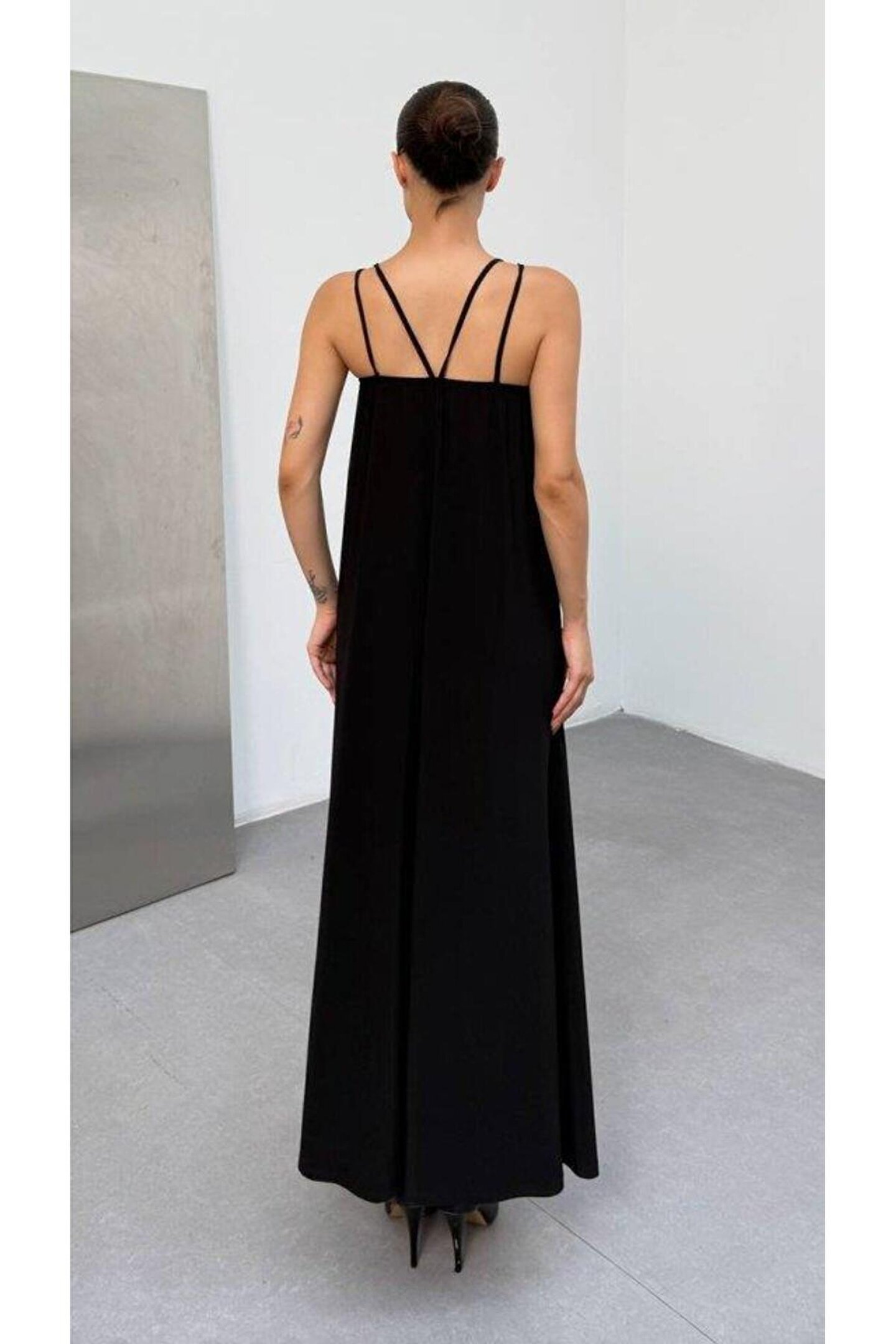 MODA Kadın Omuz Askılı Kuş Gözü Zincir Detay Sandy Kumaş Maxi Boy Elbise