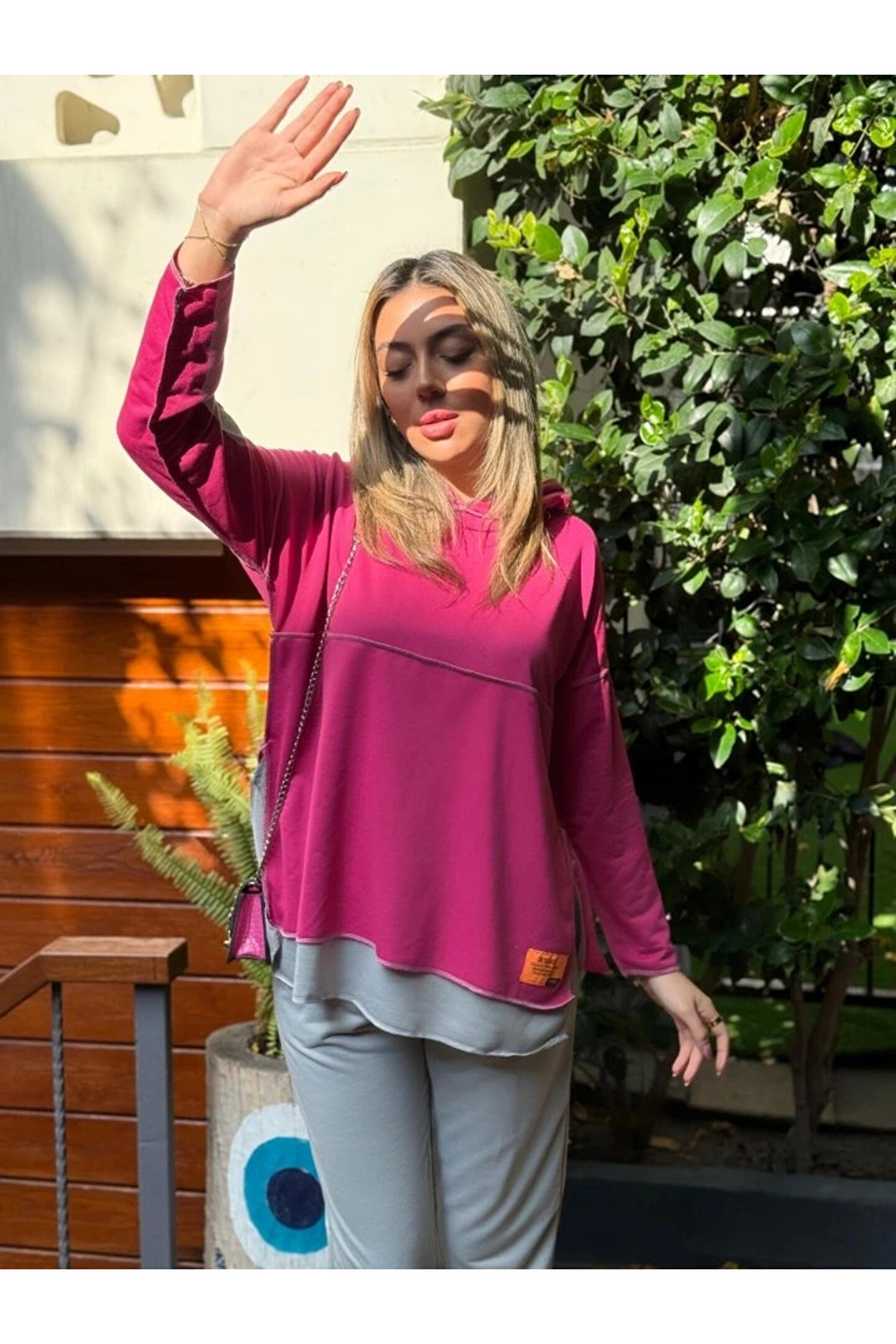 MODA Kadın Pembe Kapşonlu Etek Ucu Detay Arma Ters Dikiş Gorunumlu Ikili Takım