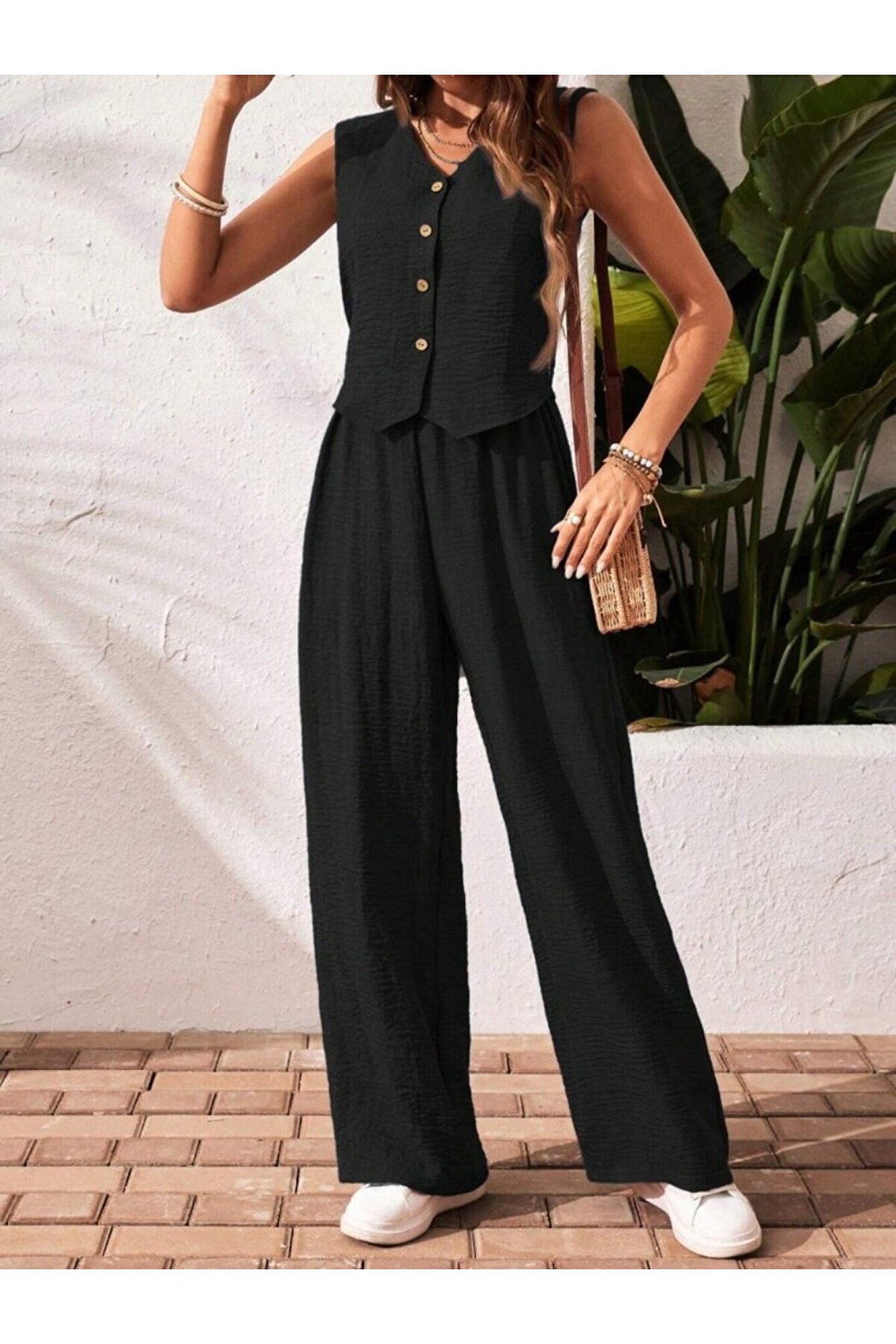 MODA Kadın Sıfır Kollu Düğmeli Yelek Ve Pantolon Bürümcük Ikili Takım