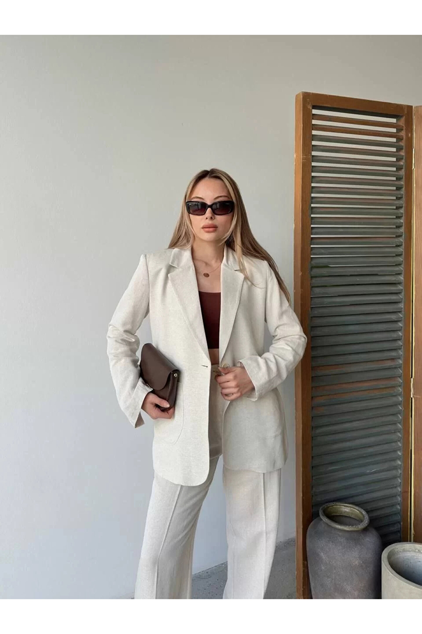 MODA Keten Ceket Pantolon İlik Düğmeli Uzun Kollu Yırtmaçlı ikili Takım - Beyaz