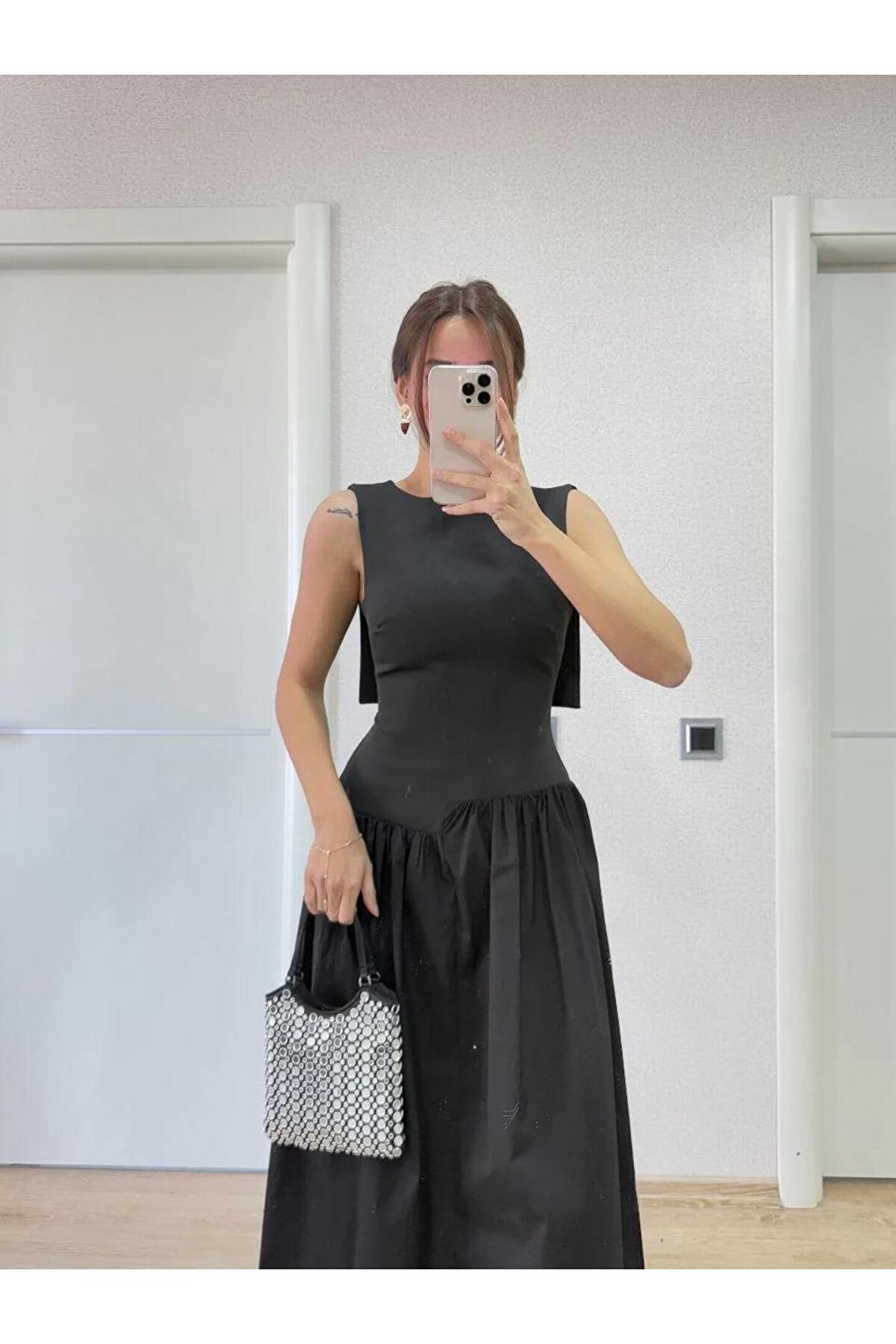 MODA Krep Arkası Kanat Arka Ön Pens Detaylı Uzun Kadın Elbise - Siyah