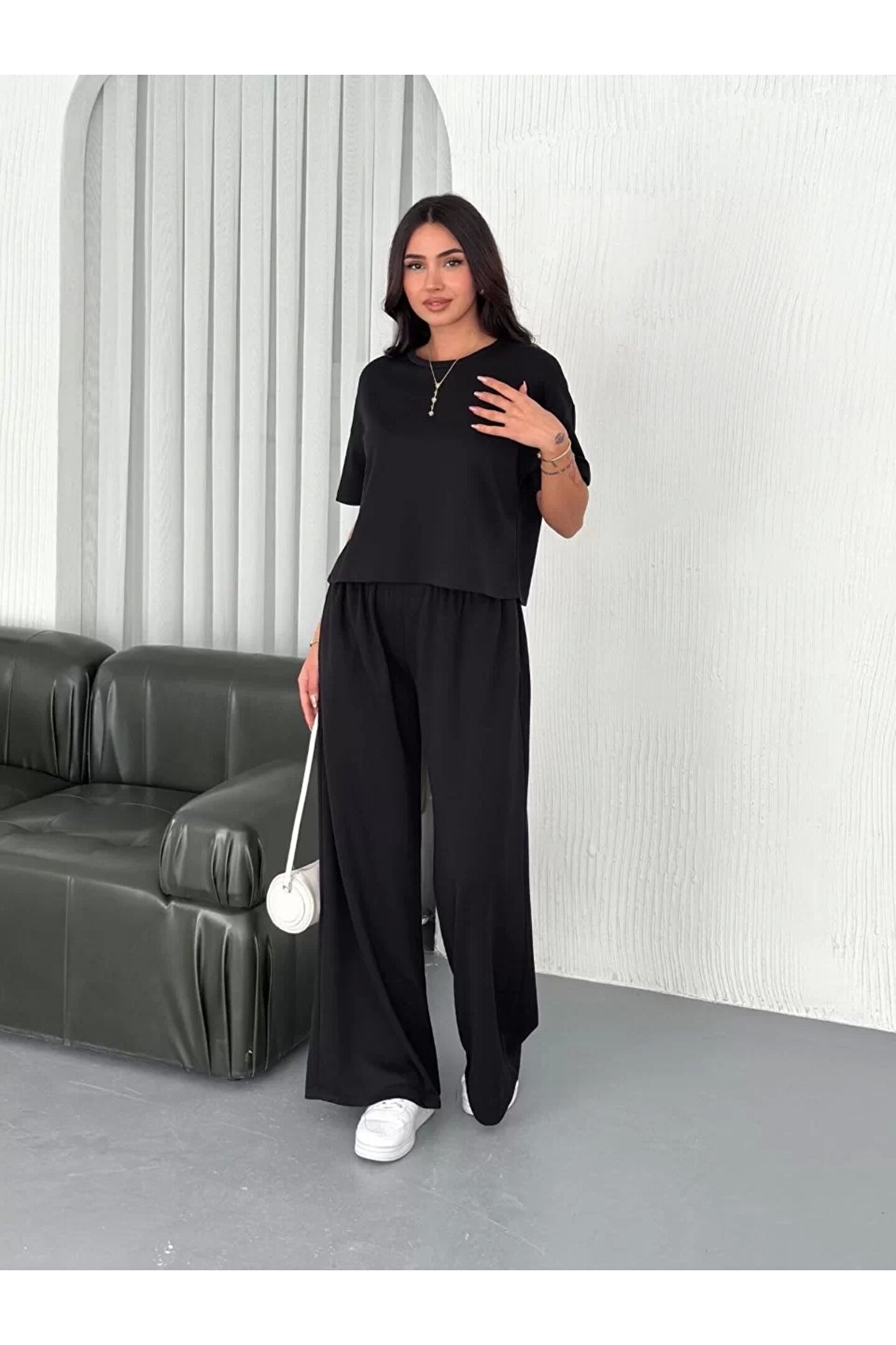MODA Osy Modal Yumuşak Dokulu Kumaş Bisiklet Yaka T-shirt Bol paça Pantalon ikili Takım -Siyah