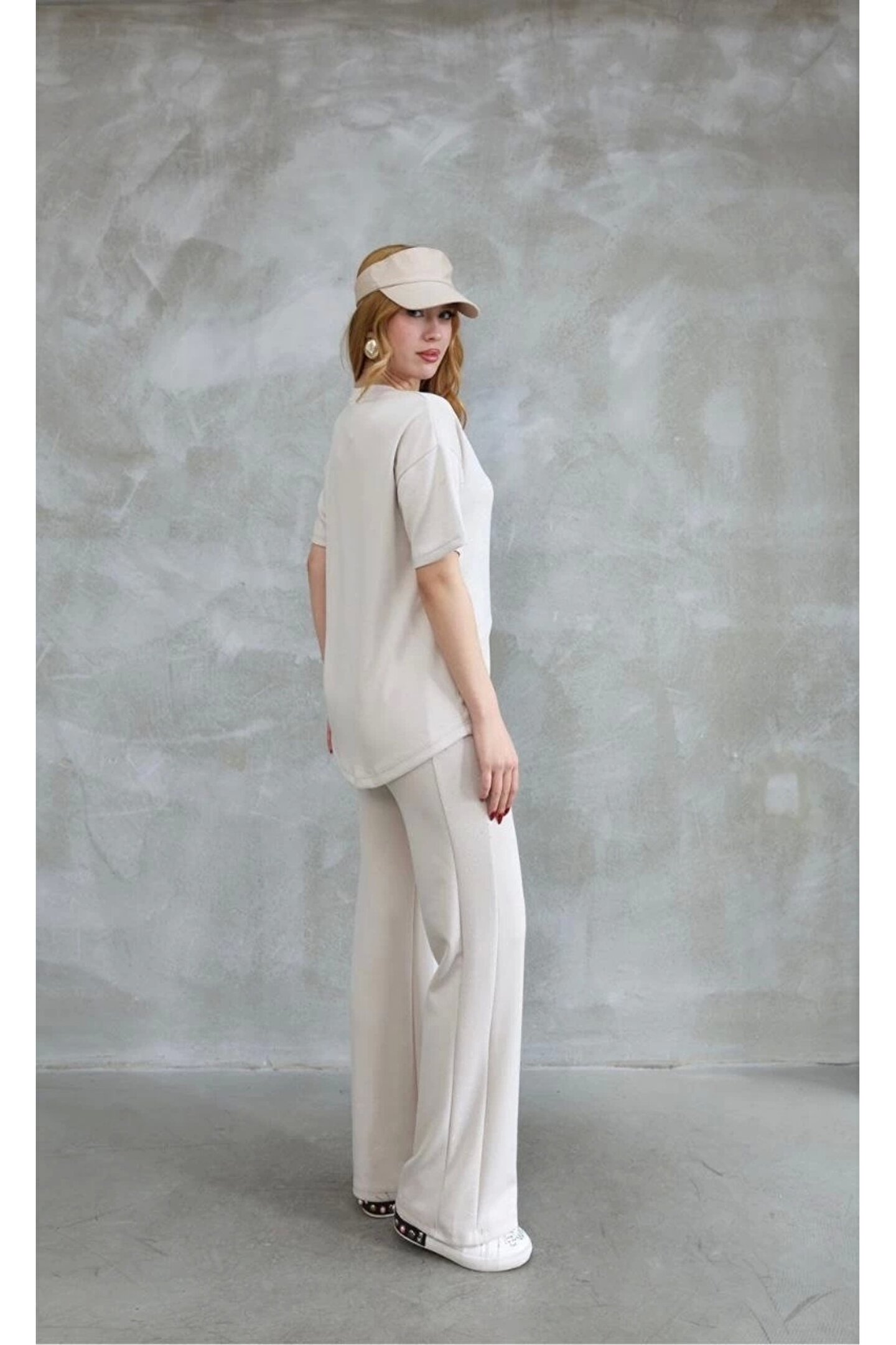 MODA Osy Modal Yumuşak dokulu Kumaş Bisiklet Yaka Taş detaylı Kısa Kollu Takım - Kırık Beyaz