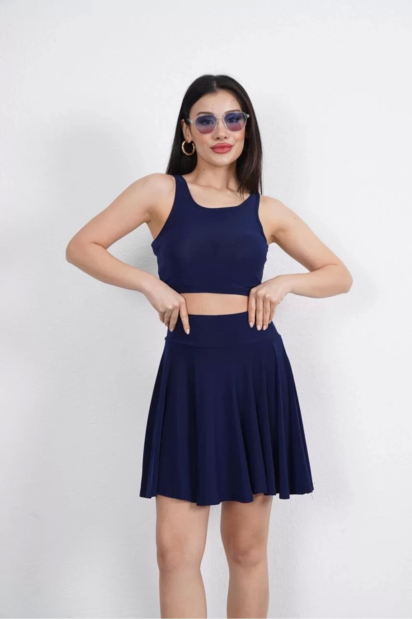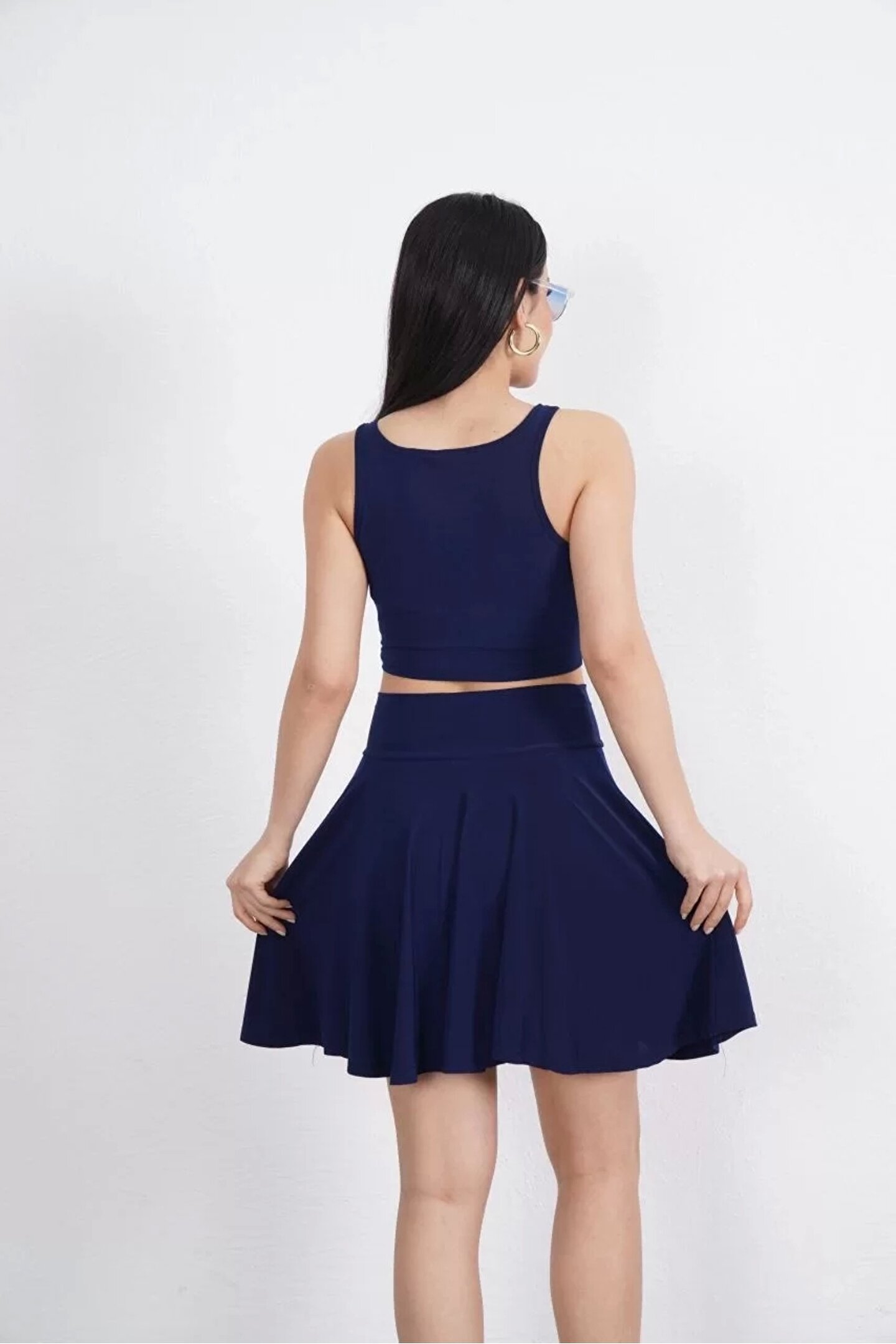 Sendy Kumaş Bisiklet Yaka Crop Şortlu Etek Ikili Takım - Lacivert