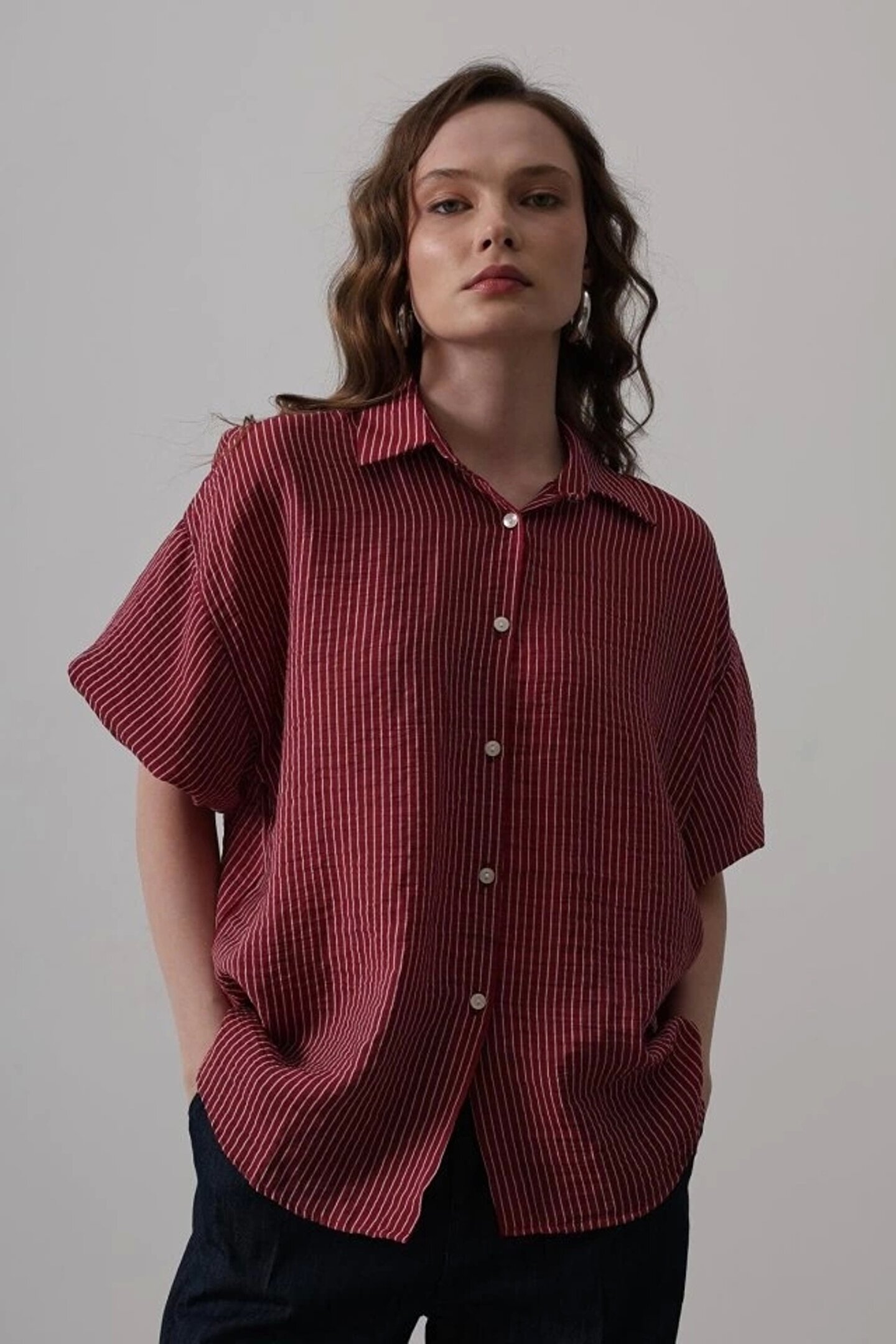 MODA Yarım Balon Kol Çizgili Gömlek - Bordo