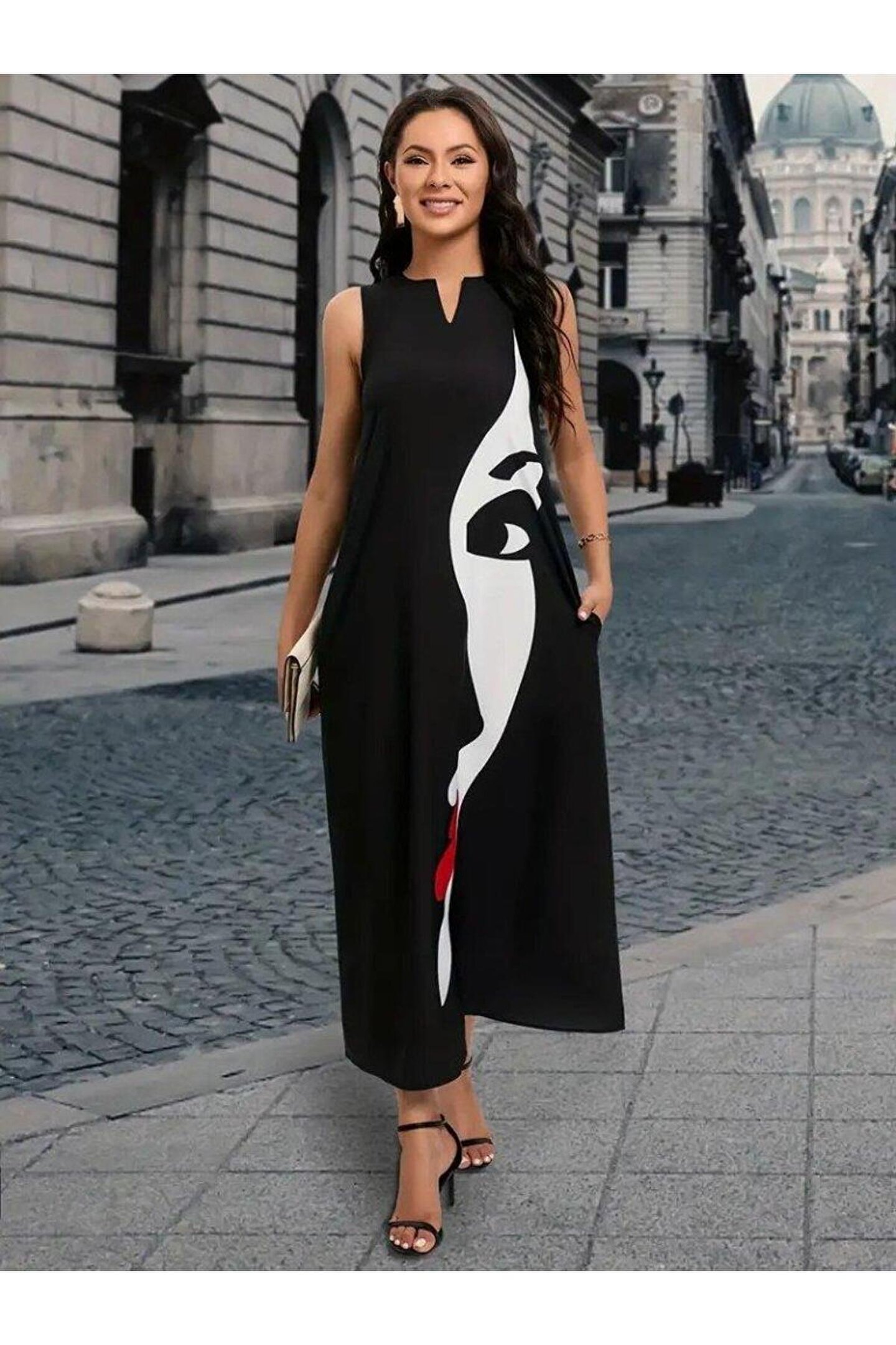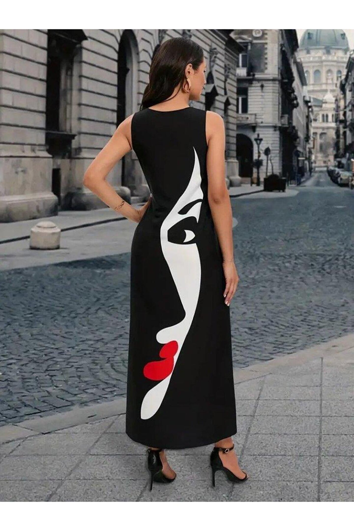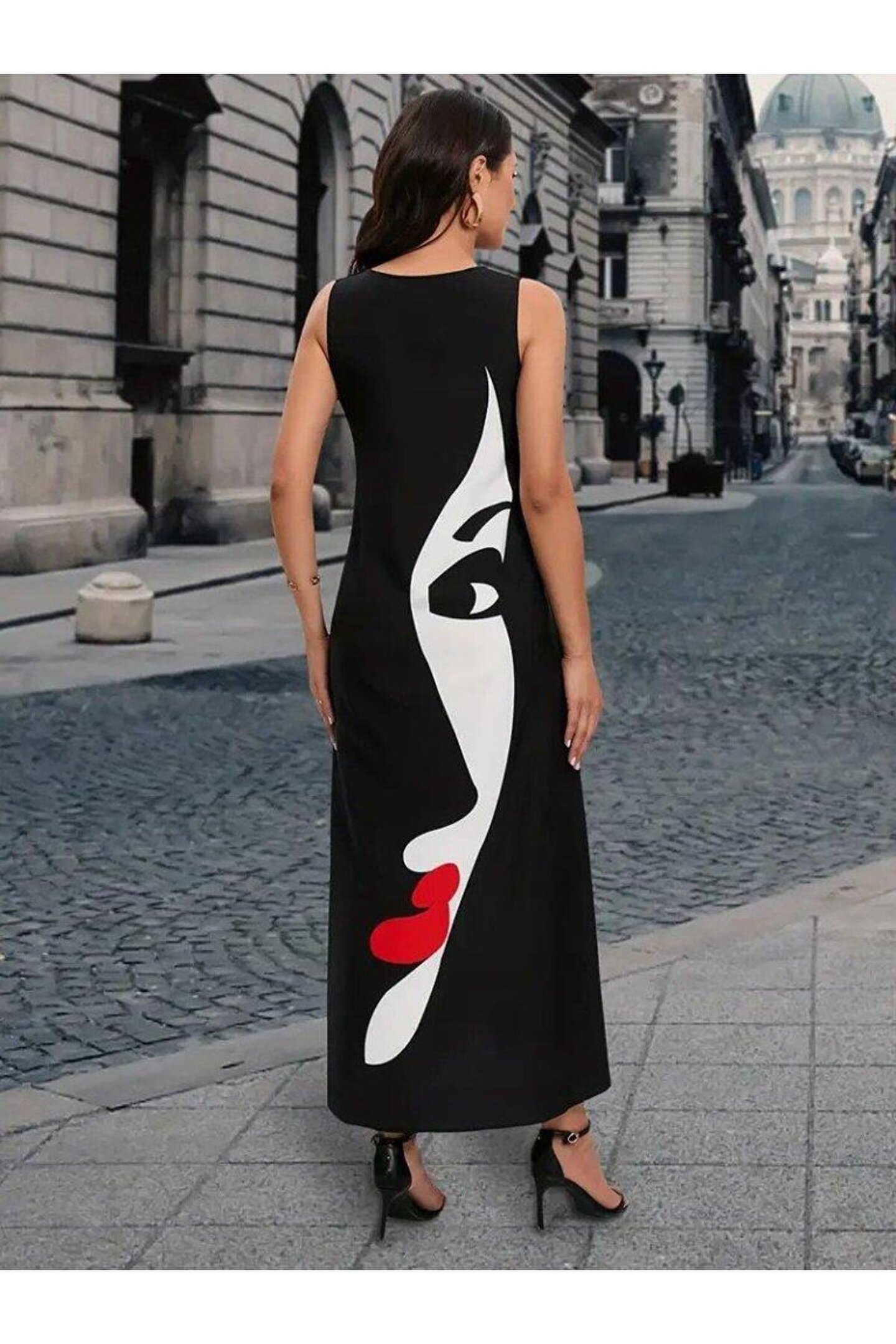 MODA55 Kadın Sıfır Kol V Yakalı Kadın Yüz Desenli Süprem Elbise