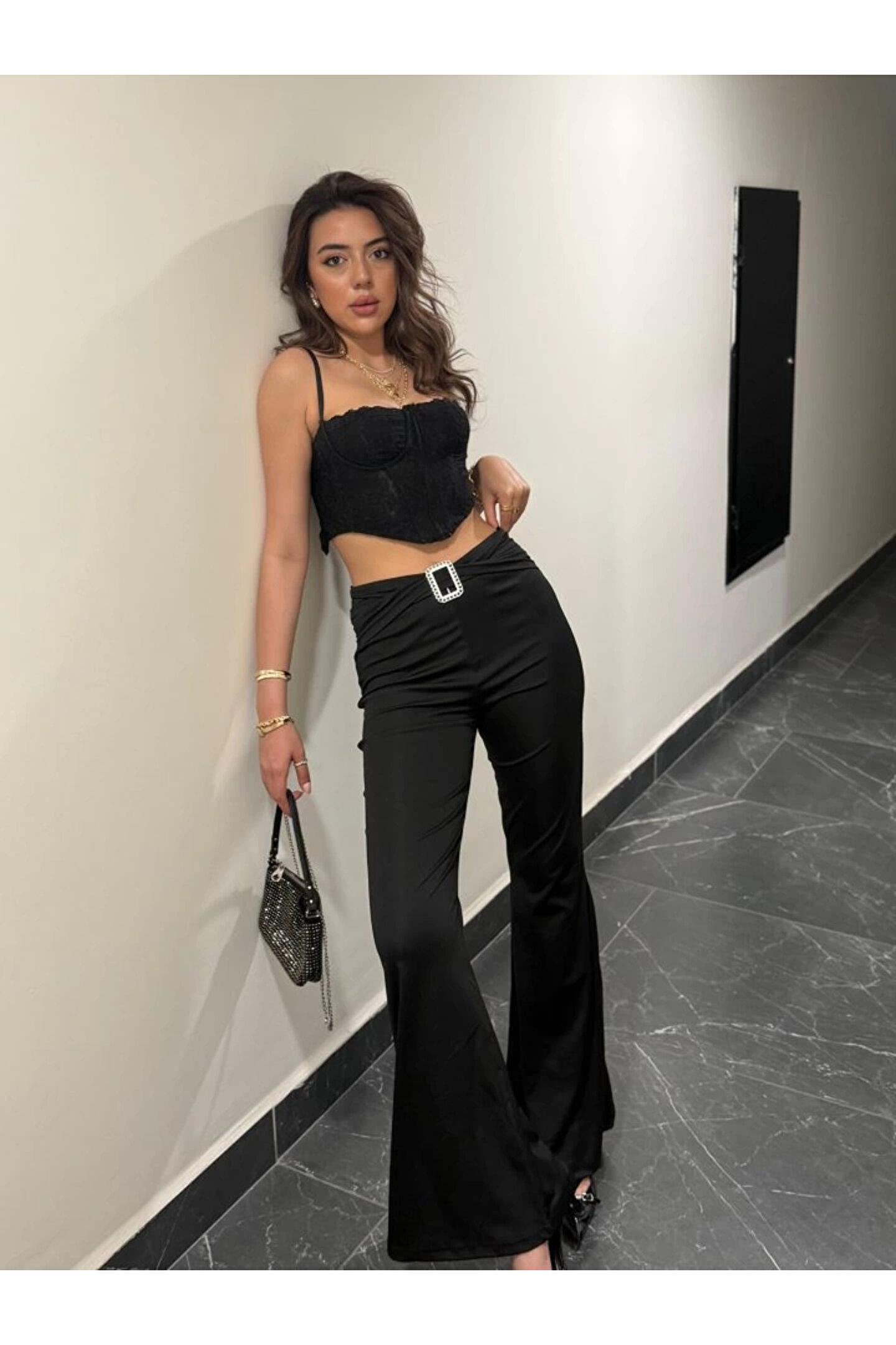 MODA55 Kadın Yüksek Bel Tokalı Ispanyol Paçalı Dalgıç Pantolon