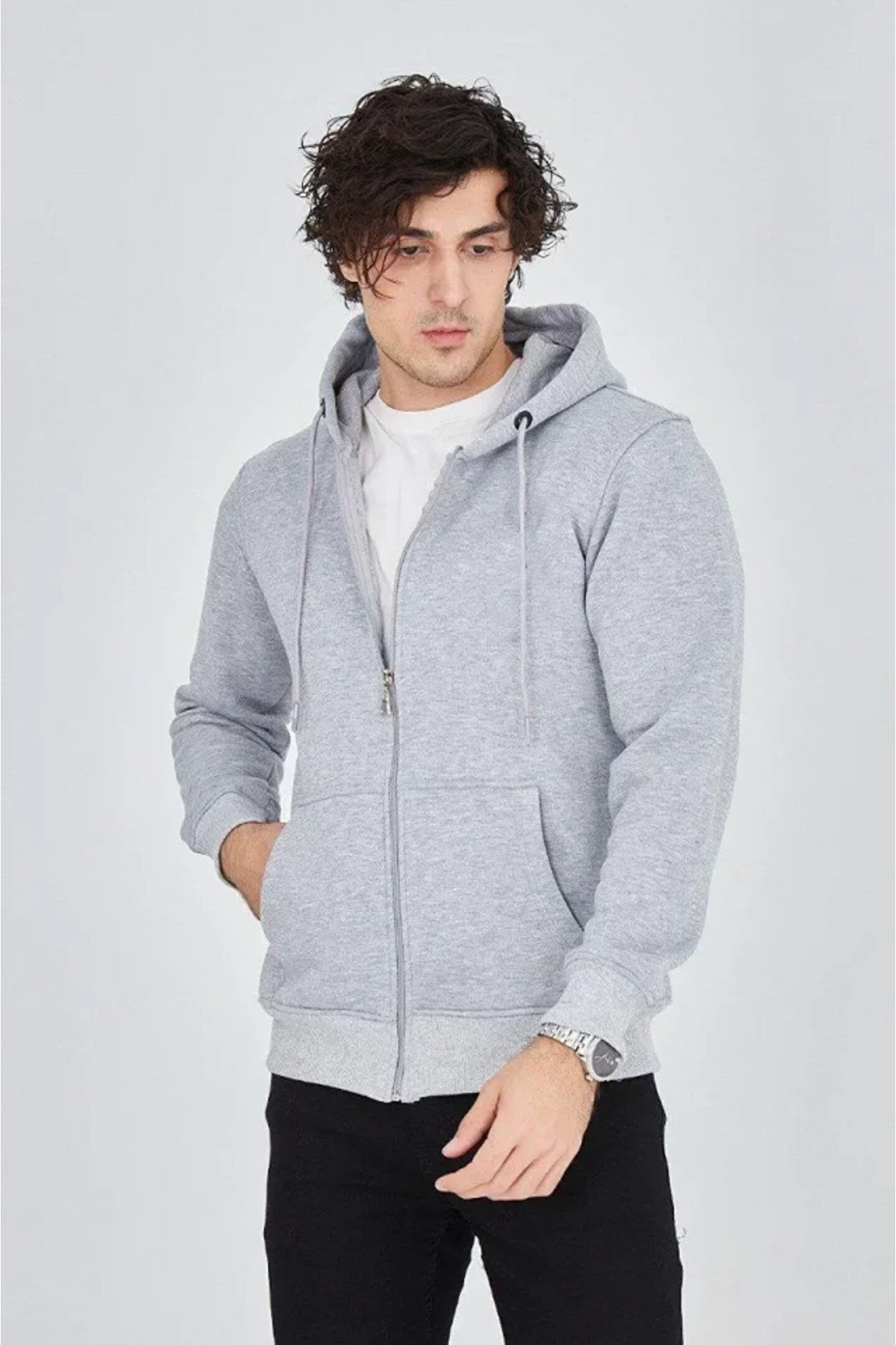 Erkek Kapüşonlu Düz Fermuarlı Hırka - Gri