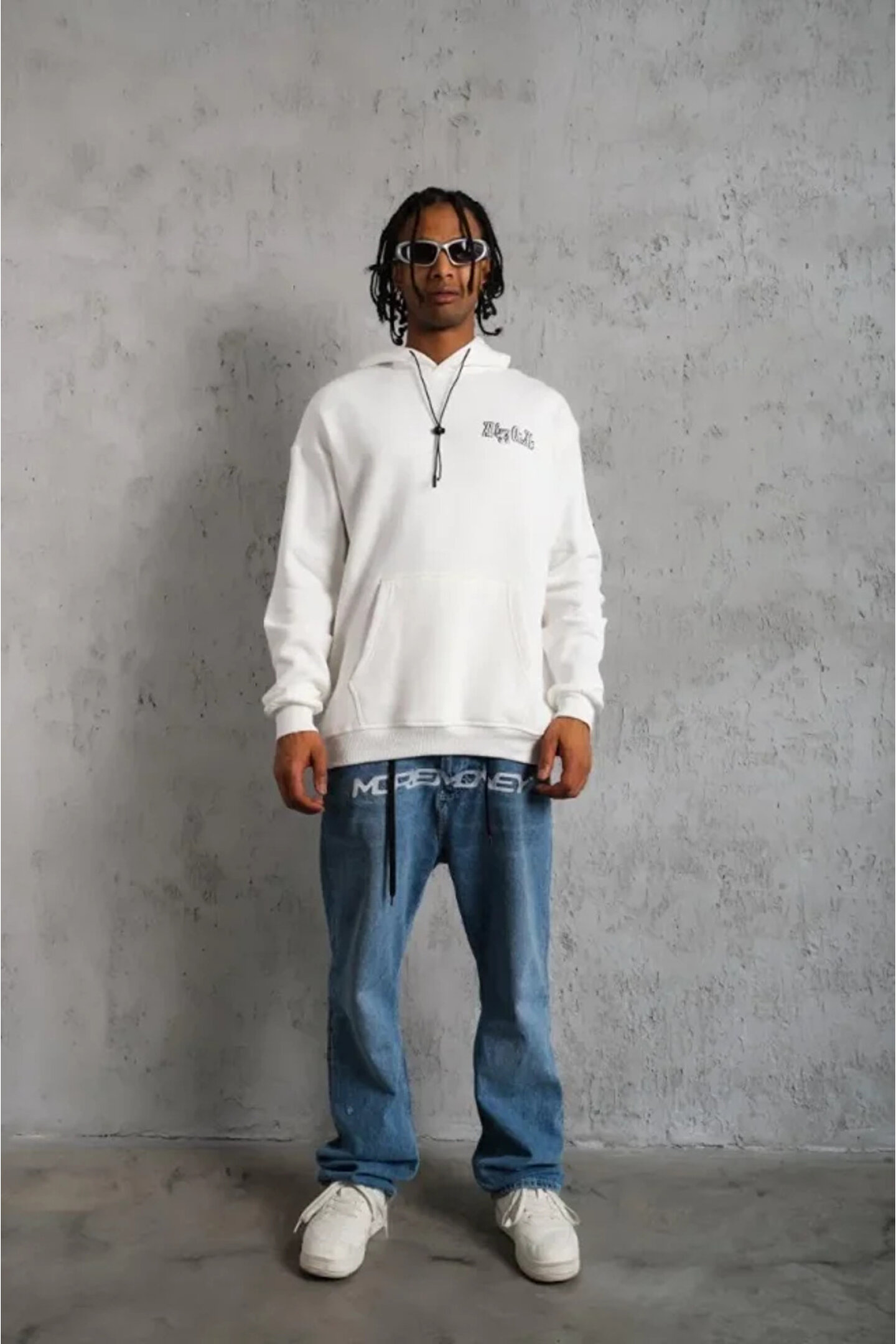 modamtn Erkek Kol ve Etek Ribana Baskılı Kapüşonlu Sweat - Beyaz