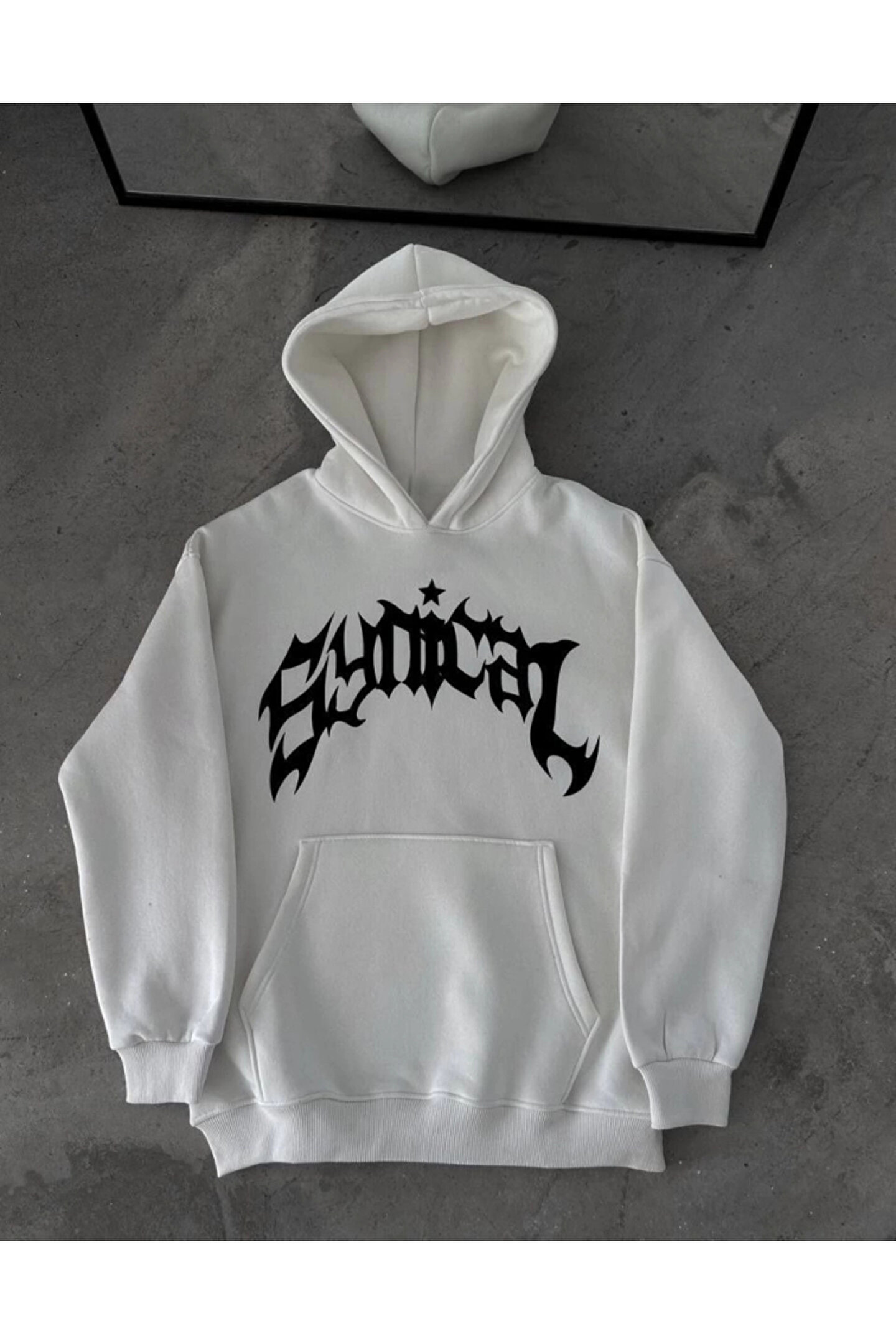 Üç İplik Kapşonlu Baskılı Oversize SweatShirt- Beyaz