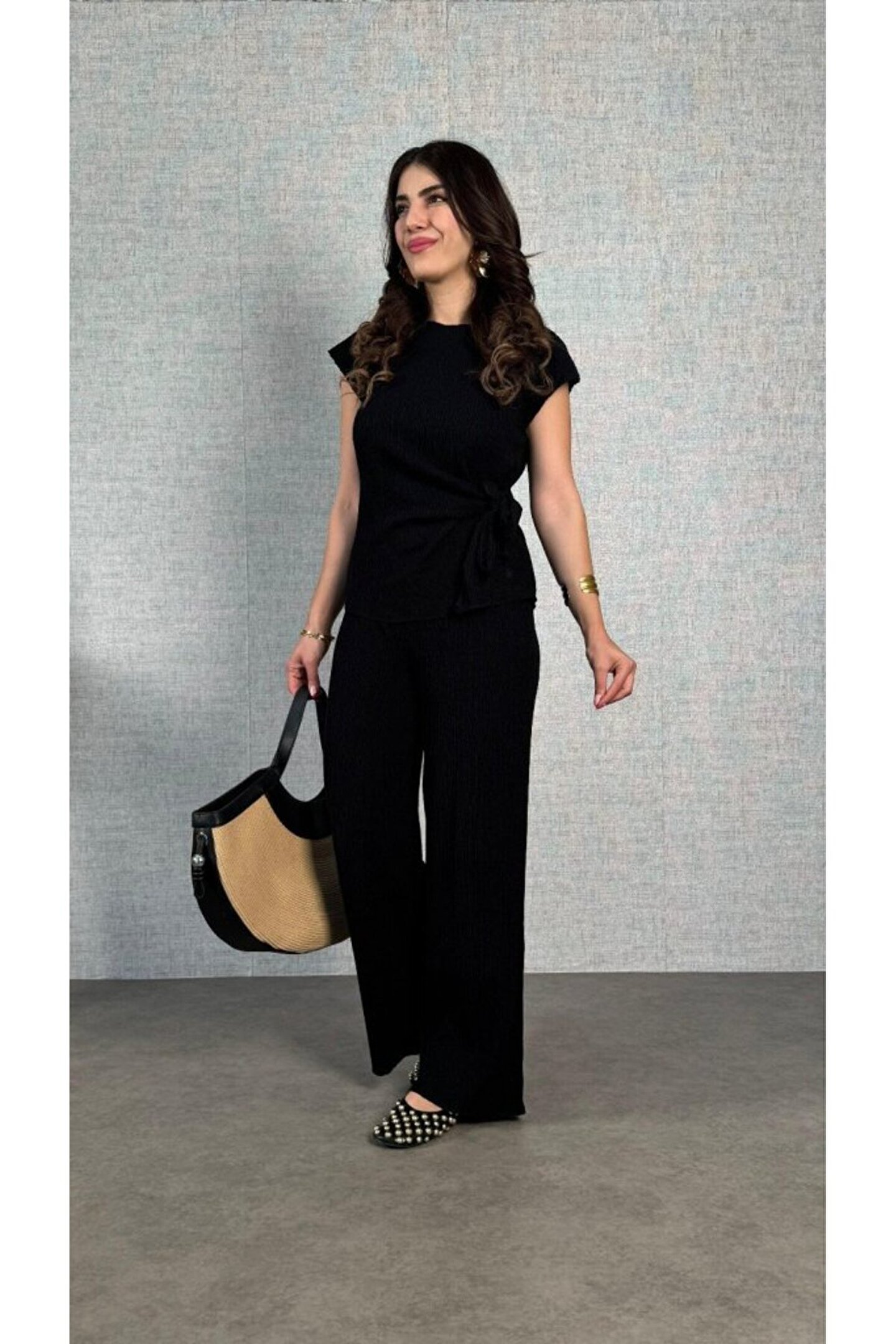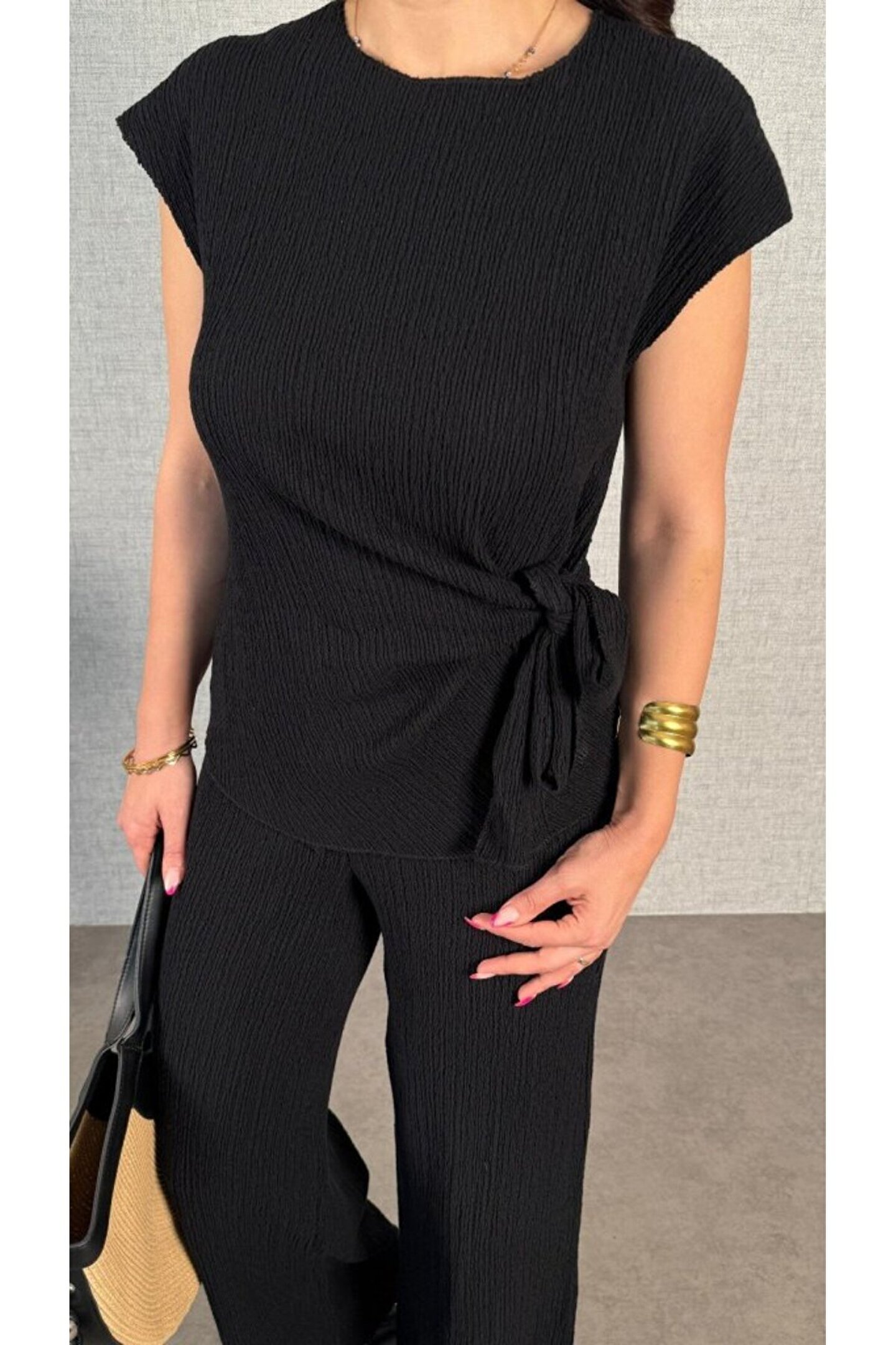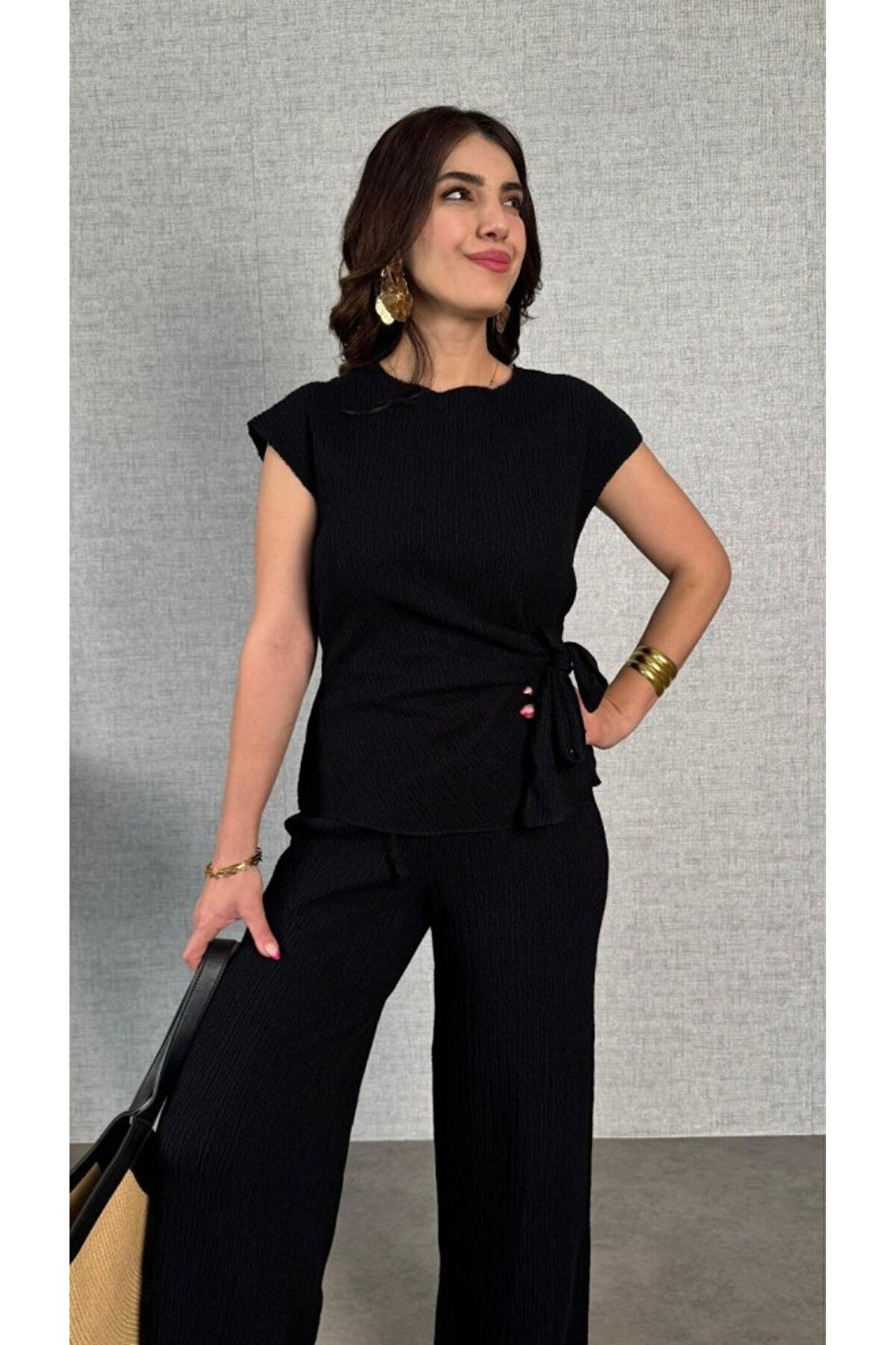 Kadın Kısa Kollu Bisiklet Yaka Yandan Bağlamalı Bürümcük Bluz Ve Pantolon Ikili Takım